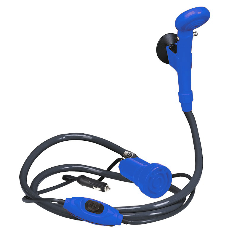 Φορητό ντους με ηλεκτρική αντλία και διακόπτη ισχύος 12V, ικανό να αντλήσει νερό και από τα μικρά δοχεία νερού. Η κεφαλή του ντους τροφοδοτείται από τον αντάπτορα του αυτοκινήτου και έτσι η στάθμη της ροής είναι ρυθμιζόμενη, με αποτέλεσμα την ευκολία και την άνεση κατά τη χρήση του ντους. Η παροχή νερού είναι περίπου 4 λίτρα το λεπτό. Η στάθμη ροής νερού μπορεί να ρυθμιστεί για να διασφαλιστεί η σωστή ροή για την προβλεπόμενη χρήση σας, ενώ το άγκιστρο χειρός και η βεντούζα επιτρέπουν την ασφαλή συγκράτησή του, τόσο κατά τη διάρκεια όσο και μεταξύ των χρήσεων. Το Camp Shower είναι ένας πολύ καλός τρόπος για να διατηρείτε καθαρή την ύπαιθρο ενώ παράλληλα, είναι κατάλληλο για πλύσιμο πιάτων και άλλων ειδών.