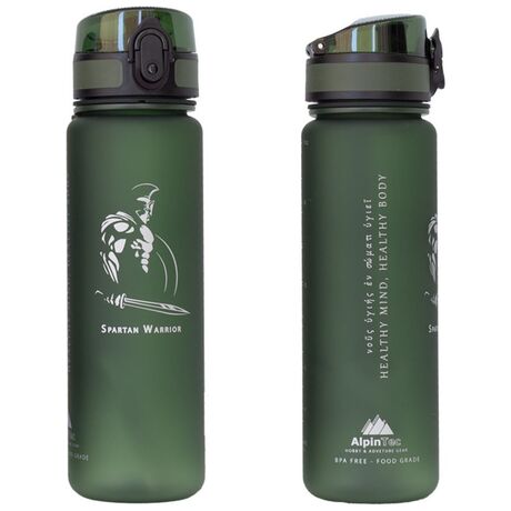 Παγούρι 500ml της AlpinTec σκούρο πράσινο με εικόνα μαχητή και επιγραφή στα Αρχαία ελληνικά! Ιδανικό αξεσουάρ για να σας συντροφεύει σε όλες σας τις δραστηριότητες όπως επίσης και σε ταξίδια μεγάλης διάρκειας, εξασφαλίζοντας την ενυδάτωση σας καθόλη την διάρκεια τους! Με βάρος μόλις 0,17 kg χωράει άνετα στο σακίδιο σας! Είναι κατασκευασμένο από υλικά τελευταίας τεχνολογίας , ανθεκτικά στην φθορά, ενώ η επένδυση της επιφάνειας με αμμοβολή διατηρεί το παγούρι σας πάντα σαν καινούργιο στην αρχική του κατάσταση! Η μοναδική υφή της επίστρωσης χαρίζει στο παγούρι απαλή και βελούδινη αίσθηση. Διαθέτει λουράκι καρπού κατασκευασμένο από μεταξένιο υλικό, αποτρέποντας πιθανούς τραυματισμούς στον καρπό σας, και για εύκολη μεταφορά του όπου εσείς επιθυμείτε. Το άνοιγμα του είναι αρκετά μεγάλο ώστε να ταιριάζει σε κάθε καρπό! Το καπάκι του παγουριού διαθέτει ένα πλατύ στόμιο που παρέχει γρήγορη και ανεμπόδιστη ροή. Ο αεραγωγός που βρίσκεται στο πάνω μέρος βοηθάει έτσι ώστε η ροή του υγρού να είναι αβίαστη χωρίς να χρειάζεται αναρρόφηση. Το καπάκι από σιλικόνη προσφέρει στεγανότητα και διατηρεί το στόμιο καθαρό! O διακόπτης ασφαλείας στο καπάκι είναι έξυπνα ενσωματωμένος στη σχεδίαση του μπουκαλιού και σας προφυλάσσει από το ενδεχόμενο διαρροών. Ασφαλίζει το καπάκι αποτελεσματικά καθιστώντας αδύνατο ένα τυχαίο άνοιγμα του μέσα στην τσάντα. Ο διακόπτης βρίσκεται γύρω από το κουμπί OPEN. Απλά απενεργοποιήστε το διακόπτη και πατήστε το κουμπί για να ανοίξει το καπάκι και να πιείτε. Είναι κατάλληλο για ζεστά και κρύα ροφήματα από -10°C έως 96°C. Συνίσταται το πλύσιμο στο χέρι, καθώς ο σχεδιασμός του είναι τέτοιος που κάνει την διαδικασία πολύ πιο εύκολη συγκριτικά με άλλα παγούρια!