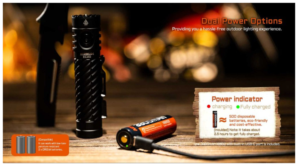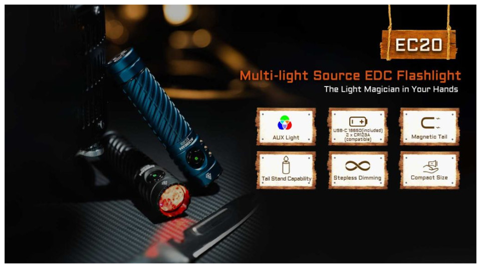 Ο EC20 είναι ένας EDC φακός με μέγιστη ένταση 2800 lumens. Διαθέτει premium LED με εξαιρετικές επιδόσεις και ισχυρή δέσμη που φτάνει έως και τα 370 μέτρα. Το βοηθητικό (AUX) φως δημιουργεί ιδανική ατμόσφαιρα για υπαίθριες δραστηριότητες όπως το camping. Ο σχεδιασμός διπλού τύπου τροφοδοσίας υποστηρίζει επαναφορτιζόμενες μπαταρίες 18650 και CR123A, καλύπτοντας διαφορετικές ανάγκες σε διάφορα περιβάλλοντα. Ο EC20 διαθέτει κλιπ και μαγνητικό καπάκι στο πίσω μέρος, προσφέροντας πολλαπλούς τρόπους μεταφοράς. Επιπλέον, η ειδική αντιολισθητική χάραξη εξασφαλίζει σταθερό και ασφαλές κράτημα.
