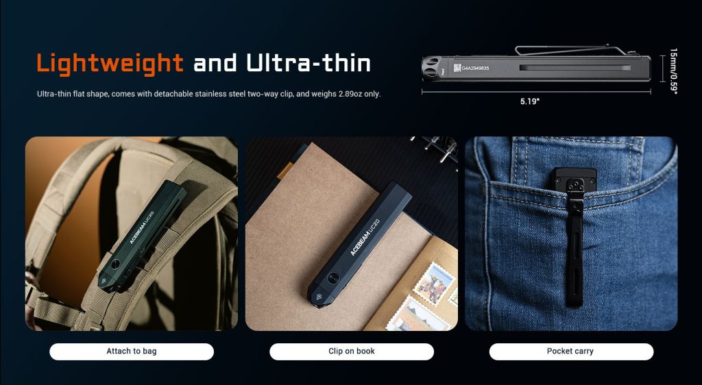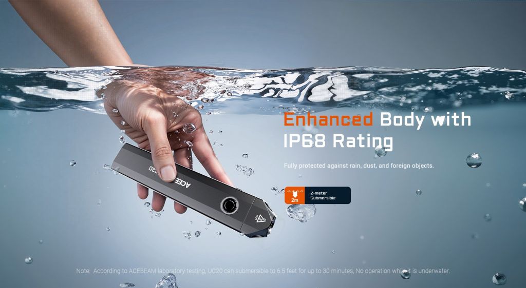 Ο ACEBEAM UC20 είναι ένας πολυλειτουργικός φακός EDC 3-σε-1, που συνδυάζει λευκό φως (1000 lumens), UV φως (365nm) και κόκκινο φως (23 lumens) για καθημερινό φωτισμό, έλεγχο σημείων και πολλά ακόμη. Ο διπλός διακόπτης στην στο πίσω μέρος προσφέρει άμεση πρόσβαση στη λειτουργία Turbo (1000 lumens) και στο strobe. Με γρήγορη φόρτιση USB-C, φορτίζει πλήρως σε μόλις 1,2 ώρες. Με αδιαβροχοποίηση 2 μέτρων και αντοχή σε πτώση από 1,5 μέτρο, είναι κατασκευασμένος για να αντέχει σε απαιτητικά περιβάλλοντα.