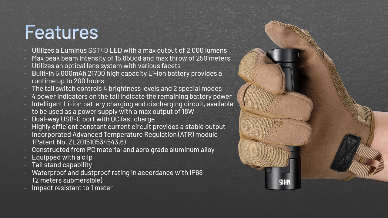 Εξαιρετικά ελαφρύς, μόλις 140 gr για να τον έχετε πάντα μαζί σας χωρίς να σας βαραίνει ή να σας κουράζει. Με κεφαλή κατασκευασμένη από κράμα αλουμινίου αεροναυπηγικής ποιότητας και πολυκαρβονικό υλικό (PC) καταφέρνει να διατηρεί την τέλεια ισορροπία απαγωγής θερμότητας και χαμηλού βάρους. Η ολοκληρωμένη τεχνoλογία ATR προσφέρει βέλτιστη απόδοση καθώς ρυθμίζει την έξοδο ανάλογα με τις εξωτερικές συνθήκες περιβάλλοντος. Το μικρό του μέγεθος και η ομαλή επιφάνειά του εξασφαλίζει εύκολη αποθήκευση και μεταφορά, διαθέτει μεταλλικό κλιπ ώστε να τον αναρτάται και να τον έχετε πάντα προσβάσιμο ενώ μπορεί να σταθεί όρθιος στην ουρά του. Οι ενδεικτικές λυχνίες στην ουρά σας υποδεικνύουν την εναπομείνουσα ισχύ της μπαταρίας με ένα σύντομο πάτημα του διακόπτη. Εξοπλισμένος με λειτουργία Beacon και SOS τον καθιστά ιδανικό για σήμανση έκτακτης ανάγκης την νύχτα κάνοντας τον εντοπισμό και την παροχή βοήθειας άμεσα.