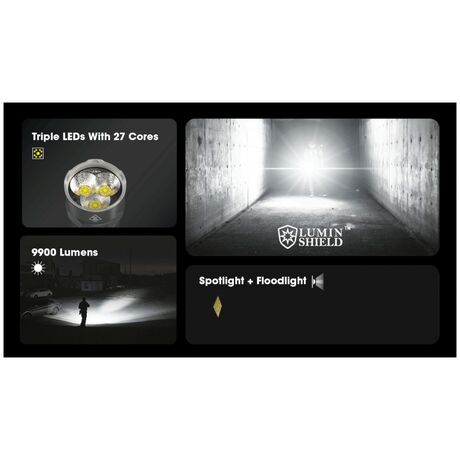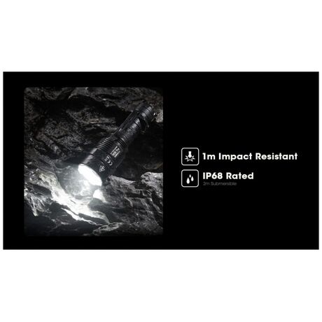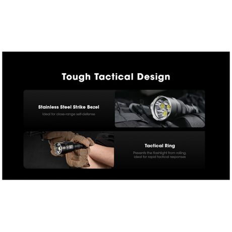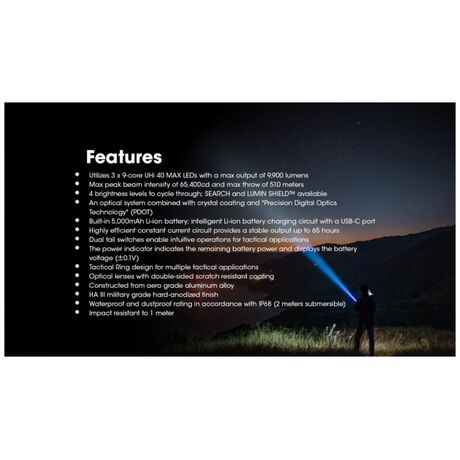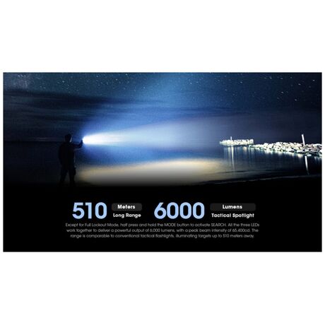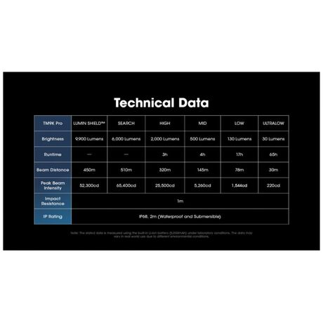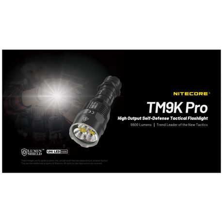 Επιχειρησιακός φακός μεγάλης ισχύος ιδανικός και για αυτοάμυνα από κοντά. Έχει ισχυρή ένταση φωτισμού που φτάνει έως 9900 lm.Έχει μεγάλη ανθεκτικότητα στο νερό,με πιστοποίηση αδιαβροχοποίησης IP68 εώς 2 μέτρα και είναι ανθεκτικός σε πτώσεις έως και από 1 μέτρο ύψος Ο TM9K Pro εισάγει μια νέα διάταξη LED με τρία καινοτόμα LED UHi 40 MAX που παρέχουν τόσο εξαιρετικά υψηλή φωτεινότητα όσο και τακτικές δυνατότητες μεγάλης εμβέλειας, ιδανικές για καθημερινή χρήση, υπαίθριες περιπέτειες ή καταστάσεις τακτικής. Εκτός από τη Λειτουργία πλήρους κλειδώματος, πατήστε έως το μέσον της διαδρομής του και κρατήστε πατημένο τον διακόπτη MODE για να ενεργοποιήσετε τον φωτισμό αναζήτησης. Και οι τρεις λυχνίες LED συνεργάζονται για να αποδώσουν έναν ισχυρό φωτισμό 6.000 lumens, με μέγιστη ένταση δέσμης 65.400 κεριά.Διαθέτει ενσωματωμένη μπαταρία Li-ion μεγάλης χωρητικότητας 5000mAh