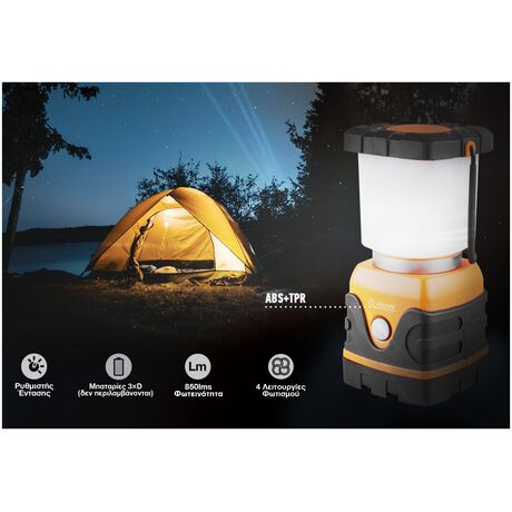 Ένα gadget που θα σας γίνει απαραίτητο στο κάμπινγκ στο βουνό ή τη θάλασσα, το ψάρεμα, την πεζοπορία, αλλά και κάθε έκτακτη ανάγκη! Πρόκειται για έναν ιδιαίτερα μεγάλης ισχύος φακό με λάμπα 850lms, που σας παρέχει το φως που χρειάζεστε και για τις νυχτερινές σας εργασίες! Κρεμάστε το φανάρι από τον γάντζο στην σκηνή σας, ή μεταφέρετε τον κρατώντας τον από την άνετη χειρολαβή 180 ο που διαθέτει. Το φανάρι LED Camping Light διαθέτει μέγιστη φωτεινότητα 850lms, η οποία είναι αρκετή για να φωτίσετε μια μεγάλη επιφάνεια. Η απόσταση που διαχέει το φως φτάνει μέχρι τα 25m. Αλλάξτε την επιλογή φωτισμού ανάμεσα στις 4 λειτουργίες, θερμός φωτισμός, ψυχρός φωτισμός, μίξη (ζεστού/ψυχρού) ή Flash, όπως επίσης ρυθμίστε και την ένταση του φωτός (dim). Το φανάρι διαθέτει 46 Led, 42 ψυχρά και 4 ζεστά. Για την λειτουργία του χρειάζεται 3 μπαταρίες τύπου D, οι οποίες δεν περιλαμβάνονται. Εύχρηστος, ανθεκτικός και με μεταλλικό χερούλι μεταφοράς για να τον μεταφέρετε παντού! Το απαραίτητο κομμάτι του εξοπλισμού σας!