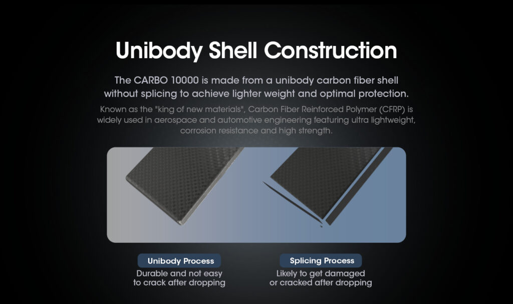 Η αντοχή σε κρούσεις από πτώσεις του CARBO10000 έχει βελτιωθεί στα 1,5 μέτρα εξαιτίας της προστασίας από το εξαιρετικά ανθεκτικό ενιαίο κέλυφος. Μπορεί να προστατέψει την μπαταρία καλύτερα ενώ ταυτόχρονα προσφέρει και προστασία από τις γρατζουνιές για να αντέχει στο πολύπλοκο εξωτερικό περιβάλλον.
