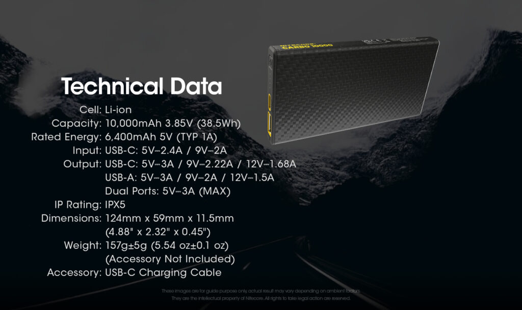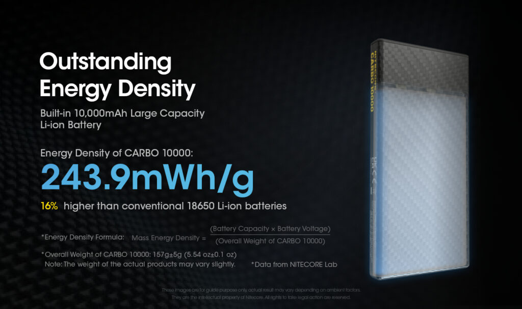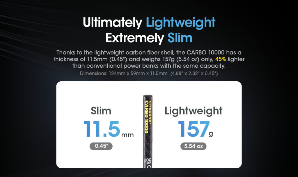 Εξαιτίας του πολύ ελαφρού κελύφους από ανθρακονήματα, το CARBO 10000 έχει πάχος 11,5mm και ζυγίζει μόλις 157g, δηλαδή 45% ελαφρύτερο από τα κοινά Power Bank με την ίδια χωρητικότητα
