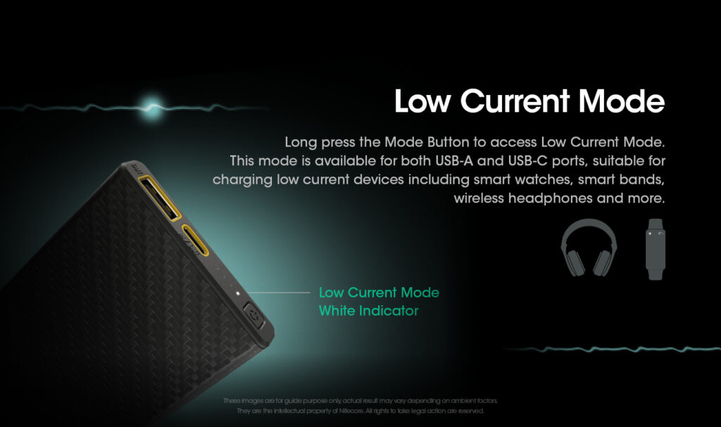 Παρατεταμένο πάτημα του διακόπτη MODE για την ενεργοποίηση της λειτουργίας φόρτισης χαμηλού ρεύματος. Αυτή η λειτουργία είναι διαθέσιμη και στις δύο θύρες USB-A & USB-C ιδανική για να φορτίζει συσκευές χαμηλού ρεύματος όπως smart watches, smart bands, ασύρματα ακουστικά κ.α.