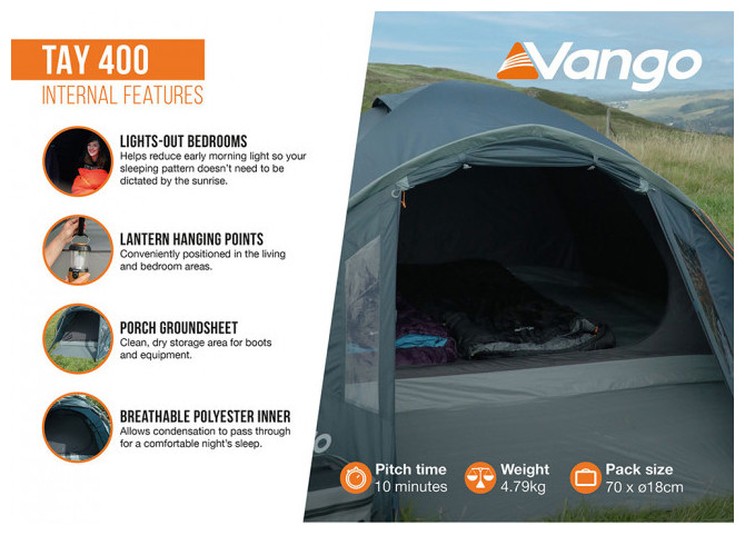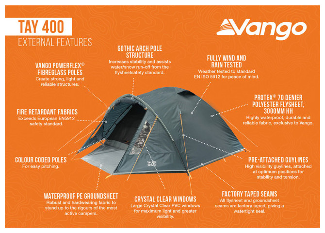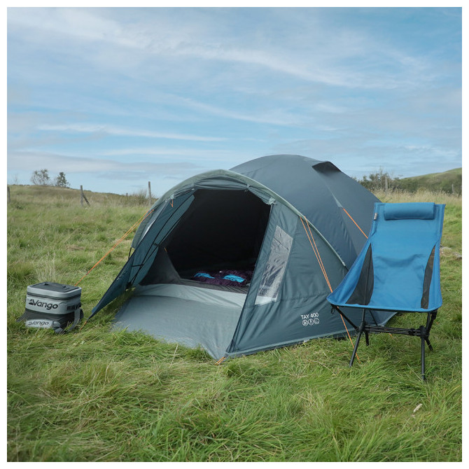 Η Tay 400 είναι μια σκηνή 4 ατόμων σε στυλ θόλου που δημιουργεί μεγάλο χώρο μέσα στη σκηνή. Τα κρυστάλλινα παράθυρα επιτρέπουν το φυσικό φως να εισχωρήσει στην περιοχή του προθάλαμου, ενώ οι μπανέλες σε σχήμα γοτθικής αψίδας παρέχουν πρόσθετη αντοχή & σταθερότητα σε αντίξοες καιρικές συνθήκες, καθώς & επιπλέον ύψος. Αυτή η σκηνή 4 ατόμων είναι η ιδανική επιλογή για κατασκηνωτές όλη την περίοδο του χρόνου.