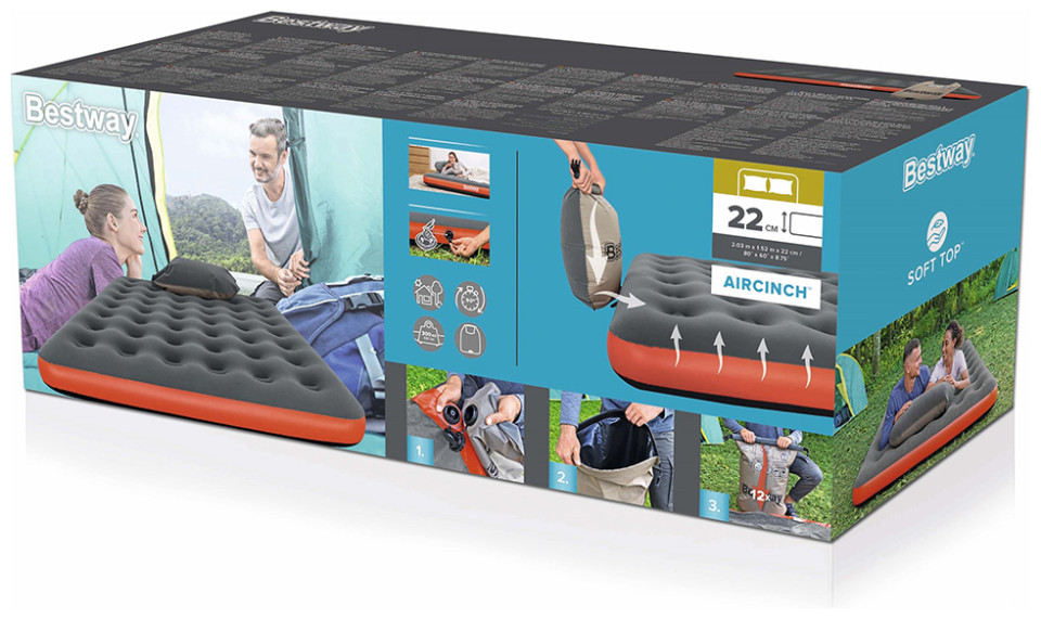 Διπλό στρώμα με μαξιλάρι που λειτουργεί και ως αντλία αέρος, ιδανικό για να σας συντροφεύει στις εξωτερικές σας δραστηριότητες και να απολαμβάνετε έναν άνετο και ξεκούραστο ύπνο όπου και αν βρίσκεστε. Με άνετες διαστάσεις 203x152x22 cm και βελούδινη επιφάνεια μπορείτε να απολαύσετε βελούδινο ύπνο σαν να βρίσκεστε στο κρεβάτι σας.Διαθέτει Βαλβίδα με κλείδωμα και quick release σε περίπρωση που χρησιμοποιήσετε τρόμπα.Φουσκώνει εύκολα μέσα σε90 δευτερόλεπτα. Περιλαμβάνετε σάκος μεταφοράς για ασφαλή αποθήκευση και εύκολη μεταφορά του στρώματος μαζί με τον υπόλοιπο εξοπλισμό σας, χωρίς να δεσμεύει χώρο.