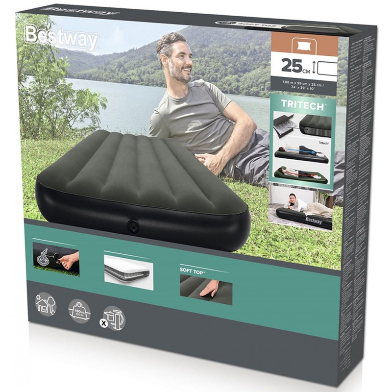 Με το φουσκωτό στρώμα TriTech™ από την Bestway®, σας περιμένει μια ξεκούραστη νύχτα! Αυτό το στρώμα υπόσχεται τεράστια αντοχή και άνετο ύπνο, ενώ είναι έτοιμο για χρήση ανά πάσα στιγμή. Διαθέτει στιβαρή κατασκευή, το ενσωματωμένο μαξιλάρι εξασφαλίζει ξεκούραστο ύπνο, το υλικό TriTech™ προσφέρει ανθεκτικότητα και αντοχή ενώ παράλληλα δίνει στο στρώμα την απαραίτητη διατήρηση του σχήματος του - ανεξάρτητα από το πόσο συχνά το φουσκώνετε και το ξεφουσκώνετε, ενώ η απώλεια αέρα κατά τη διάρκεια της νύχτας ελαχιστοποιείται πάρα πολύ. Διαθέτει μια μεγάλη βαλβίδα ταχείας απελευθέρωσης δύο κατευθύνσεων, η οποία επιτρέπει γρήγορο και εύκολο φούσκωμα. Είτε στο κάμπινγκ, είτε στο σπίτι, αυτό το στρώμα μπορεί να φουσκώσει μέσα σε λίγα λεπτά με μια τρόμπα αέρα (δεν περιλαμβάνεται).