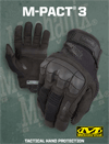 Ένα ισχυρό μονοκόμματο θερμοπλαστικό καουτσούκ (TRP) που προστατεύει τις αρθρώσεις είναι ανατομικά σχεδιασμένο ώστε να απορροφά την βίαιη πρόσκρουση το πίσω μέρος του χεριού ενώ ταυτόχρονα βελτιώνει την συνολική κινητικότητα κατά την διάρκεια σκληρών επιχειρήσεων. Το εξωτερικό στον αντίχειρα και τα άλλα δάχτυλα προστατεύονται από γέμιση τύπου ακορντεόν από υλικό EVA 3mm, ενώ το χαμηλού προφίλ κλείσιμο από θερμοπλαστικό καουτσούκ (TRP) δημιουργεί ασφαλή εφαρμογή στον καρπό. Τα M-Pact® 3 διαθέτουν εσωτερική ενίσχυση στην άκρη των δαχτύλων για ακραία αντοχή στην τριβή και ανάγλυφη σχηματομορφή για πρόσθετη πρόσφυση όταν την χρειάζεστε. Η κατασκευή της παλάμης δύο περιοχών ενισχύει τις περιοχές υψηλής φθοράς και μειώνει το "μάζεμα" του υφάσματος κατά την χρήση των όπλων ή των εργαλείων.