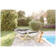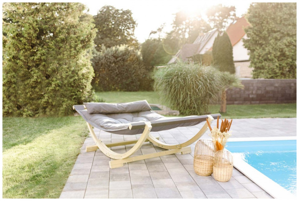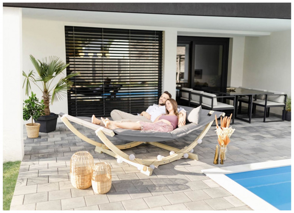 Μια πολυτελής αιώρα - κρεβάτι για έως 2 άτομα (μέγεθος διπλού κρεβατιού).Επιφάνεια που αιωρείται για επιπλέον άνεση και χαλάρωση.Το εξαιρετικά στιβαρό υφασμάτινο κάλυμμα "Agora" είναι εξαιρετικά ανθεκτικό, μαλακό σαν βαμβάκι, έχει υψηλή αντοχή στο φως και στις καιρικές συνθήκες (αντοχή στο φως: 7/8)Είναι υδατοαπωθητικό (εξαιρετικά γρήγορο στέγνωμα)και ανθεκτικό στη μούχλα.Μη ευαίσθητο στη βρωμιά και εύκολο στη φροντίδα (η βρωμιά μπορεί απλά να αφαιρεθεί ή να καθαριστεί με ηλεκτρική σκούπα).Μπορεί να χρησιμοποιηθεί ως ξαπλώστρα για ηλιοθεραπεία λόγω της υψηλής αντοχής στο φως.Αφαιρούμενο, εξαιρετικά μαλακό μαξιλάρι με επένδυση (πλένεται χωρίς επένδυση).Στιβαροί βρόχοι στήριξης για ομοιόμορφη κατανομή βάρουςΤα φαρδιά σημεία στήριξης και στα δύο άκρα αντισταθμίζουν το φορτία και εξασφαλίζουν σταθερότητα.Η χειροποίητη κατασκευή εγγυάται την υψηλότερη ποιότητα.Επεξεργασμένο ξύλο ελάτης με πιστοποίηση FSCTM, ανθεκτικό στις καιρικές συνθήκες από βιώσιμη διαχείριση δασών σε ευρωπαϊκά κρατικά δάση.Τα εξαρτήματα και οι βίδες είναι κατασκευασμένοι από ανθεκτικό στη σκουριά γαλβανιζέ μέταλλο.Η υψηλής ποιότητας κόλληση στρώσεων προσφέρει εξαιρετική σταθερότητα και ασφάλεια.Ο εμποτισμός εμβάπτισης διασφαλίζει ότι το πλαίσιο είναι ανθεκτικό στις καιρικές συνθήκες.