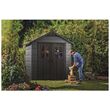 Αυτό το υπόστεγο εργαλείων εξακολουθεί να προσφέρει άφθονο χώρο για την αποθήκευση εργαλείων και σκευών κήπου. Η πρακτική διπλή πόρτα επιτρέπει επίσης την αποθήκευση μεγάλων, ογκωδών αντικειμένων στο σπίτι της συσκευής. Ο γενναιόδωρος φεγγίτης επιτρέπει την πρακτική χρήση του φωτός της ημέρας. Επιπλέον, το πλαστικό υπόστεγο εργαλείων είναι εξοπλισμένο με δύο παράθυρα στη διπλή πόρτα, τα οποία παρέχουν επιπλέον φως.