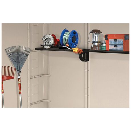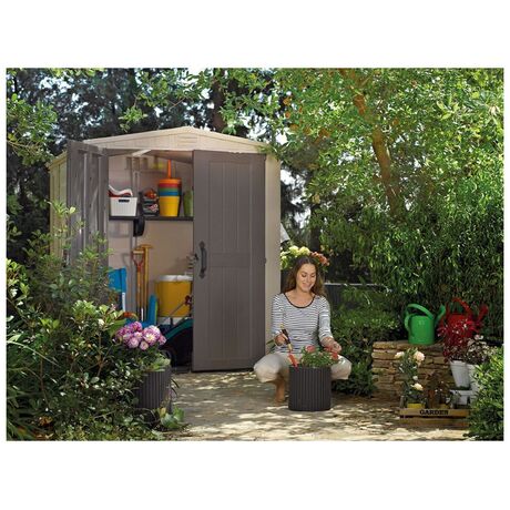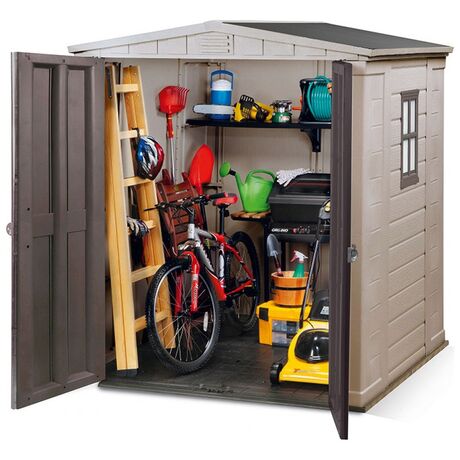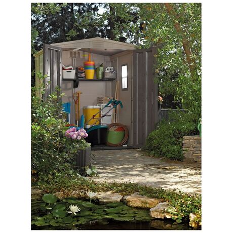 Πλαστική αποθήκη κήπου της Keter ιδανική επιλογή αποθήκευσης για τα εργαλεία σας και όλο τον εξοπλισμό του κήπου σας. Η πολύ μεγάλη περιοχή και το έξυπνο σύστημα ραφιών διασφαλίζουν ότι τα εργαλεία και τα σκεύη κήπου αποθηκεύονται καλά και προστατεύονται από τον άνεμο και τη βροχή. Τόσο η διπλή πόρτα όσο και το παράθυρο υπογραμμίζουν τον πρακτικό και χρηστικό χαρακτήρα. Ο φεγγίτης και ο ενσωματωμένος αερισμός παρέχουν άνετες συνθήκες εργασίας. Ο όμορφος σχεδιασμός και η εξαιρετική σταθερότητα το καθιστούν την τέλεια επιλογή.