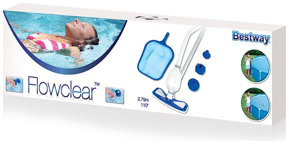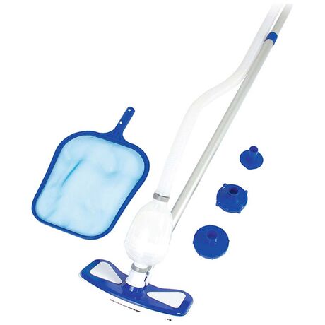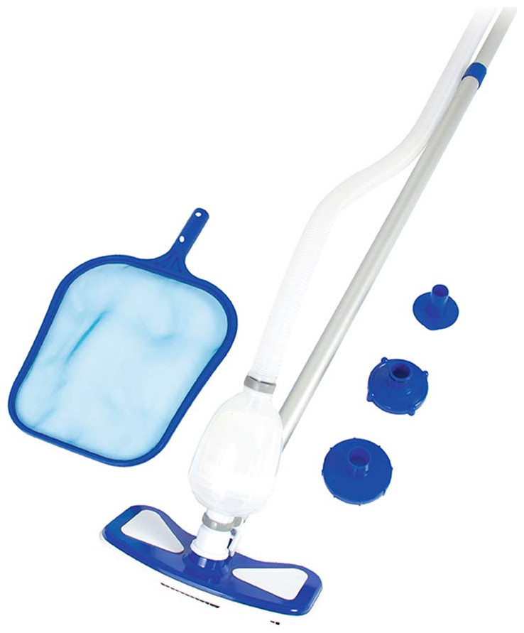 Σετ καθαρισμού πισίνας Bestway ιδανικό για την σωστή συντήρηση της πισίνας σας. Στο κιτ περιλαμβάνεται ηλεκτρική σκούπα για την απορρόφηση της βρωμιάς και άλγης στα πλαϊνά και το πάτωμα της πισίνας σας, ενώ το δίχτυ Skimmer μαζεύει τα φύλλα, έντομα και υπολείμματα από την επιφάνεια του νερού. Οι εναλλάξιμες κεφαλές σας επιτρέπουν να κάνετε εύκολα εναλλαγές μεταξύ των εργασιών χωρίς κόπο και εύκολα. Ο πόλος αλουμινίου μήκους 9 ποδιών επιτρέπει στην ηλεκτρική σκούπα και το skimmer της πισίνας να καθαρίζουν δύσκολα προσβάσιμες περιοχές μιας πισίνας πάνω από το έδαφος. Ιδανικό για υπέργειες πισίνες με διάμετρο 15' και κάτω. Εύκολη χρήση χωρίς να χρειάζεται μπαταρίες ή φόρτιση, απλώς συνδέστε τον εύκαμπτο σωλήνα στην αντλία φίλτρου της πισίνας σας για να έχετε μια ισχυρή ελαφριά ηλεκτρική σκούπα για τον καθαρισμό των τοίχων και των δαπέδων της πισίνας ως μια προσιτή εναλλακτική λύση. Τα υπολείμματα και τα σκουπίδια συλλέγονται σε αφαιρούμενη και επαναχρησιμοποιήσιμη σακούλα απορριμμάτων. Μια εύκολη και πρακτική λύση για τον καθαρισμό της πισίνας σας, χωρίς να χρειάζεται να την καθαρίζεται τρίβοντας με το χέρι τα υπολείμματα.