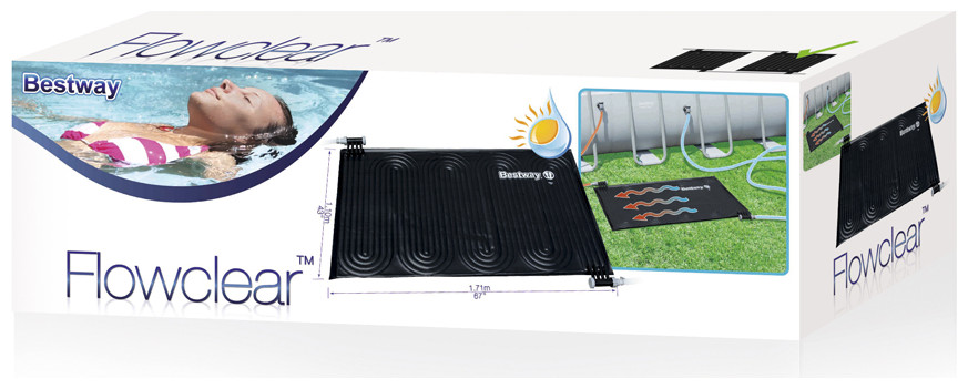 Ηλιακό πάνελ από την κορυφαία εταιρεία Bestway, απαραίτητο αξεσουάρ για να θερμαίνει την πισίνα σας! Αποτελεί μια αποτελεσματική μέθοδο θέρμανσης νερού αξιοποιώντας την ηλιακή ενέργεια σε πλαισιωμένες και προκατασκευασμένες πισίνες, ενώ ανάλογα με το απαιτούμενο επίπεδο θέρμανσης μπορείτε να συνδέσετε είτε ένα πίνακα είτε περισσότερους σε σειρά για να αυξήσετε τις θερμοκρασίες του νερού κατά περίπου 3-5°C ανάλογα με τις καιρικές συνθήκες. Το πάνελ είναι κατασκευασμένο από PVC βινυλίου υψηλής αντοχής, ανθεκτικό στην υπεριώδη ακτινοβολία, τα χημικά και τη φθορά.