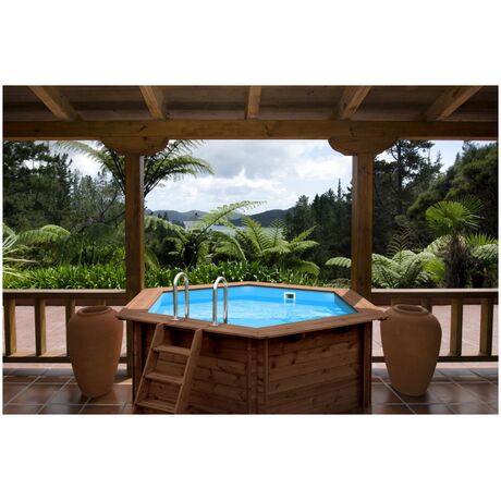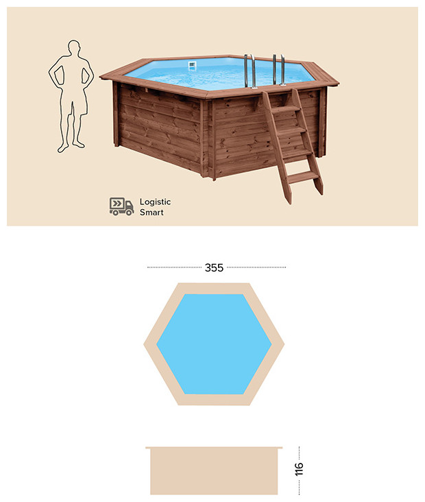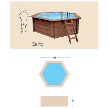 Μία στρογγυλή οικογενειακή πισίνα εξαιρετικής ποιότητας με διάμετρο 355 cm και εξωτερικό ύψος 116 cm η οποία ανήκει στη σειρά Summer Joy της Abatec και διαθέτει χωρητικότητα 5,560 λίτρα νερού. Η πισίνα ταιριάζει εξαιρετικά στον κήπο κάθε σπιτιού λόγω του φυσικού υλικού και του αρχιτεκτονικού σχεδιασμού της και μπορεί να τοποθετηθεί πάνω στο έδαφος ή και μέσα σε αυτό. Είναι κατασκευασμένη από υψηλής ποιότητας ξύλο το οποίο έχει αντοχή στο χρόνο αλλά και στο εξωτερικό υγρό περιβάλλον. Τα τείχη της πισίνας έχουν πάχος 45 mm και επομένως είναι εξαιρετικά καλά θερμομονωμένα. Το βάθος νερού της πισίνας είναι 100 cm,διαθέτει αντιολισθητικό δάπεδο και έτσι είναι ασφαλής για τα παιδιά. Επίσης διαθέτει αποσπώμενη σκάλα για την εύκολη είσοδο και έξοδο στην πισίνα σας. Είναι ιδανική για να δροσιστείτε και να παίξετε τις ζεστές ημέρες του καλοκαιριού με τα αγαπημένα σας πρόσωπα. Συμβουλευτείτε μας σχετικά με τα χημικά καθαριστικά που είναι απαραίτητα για τη συντήρηση και τη σωστή χρήση της πισίνας σας, ώστε να απολαμβάνετε χωρίς φόβο τις βουτιές σας!