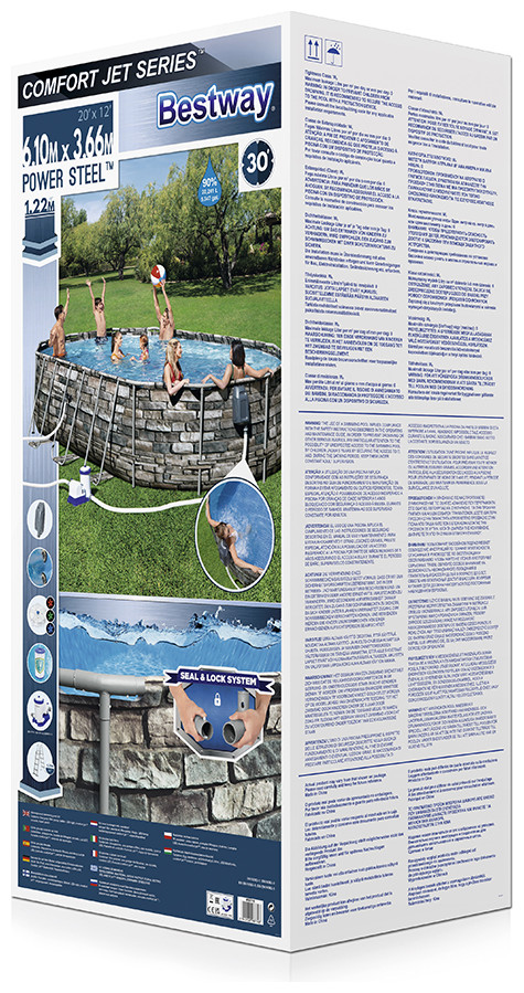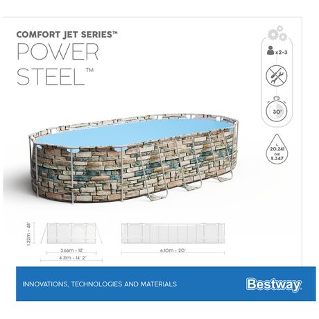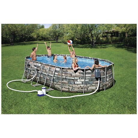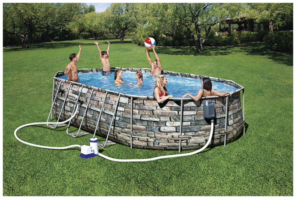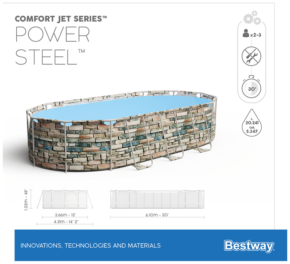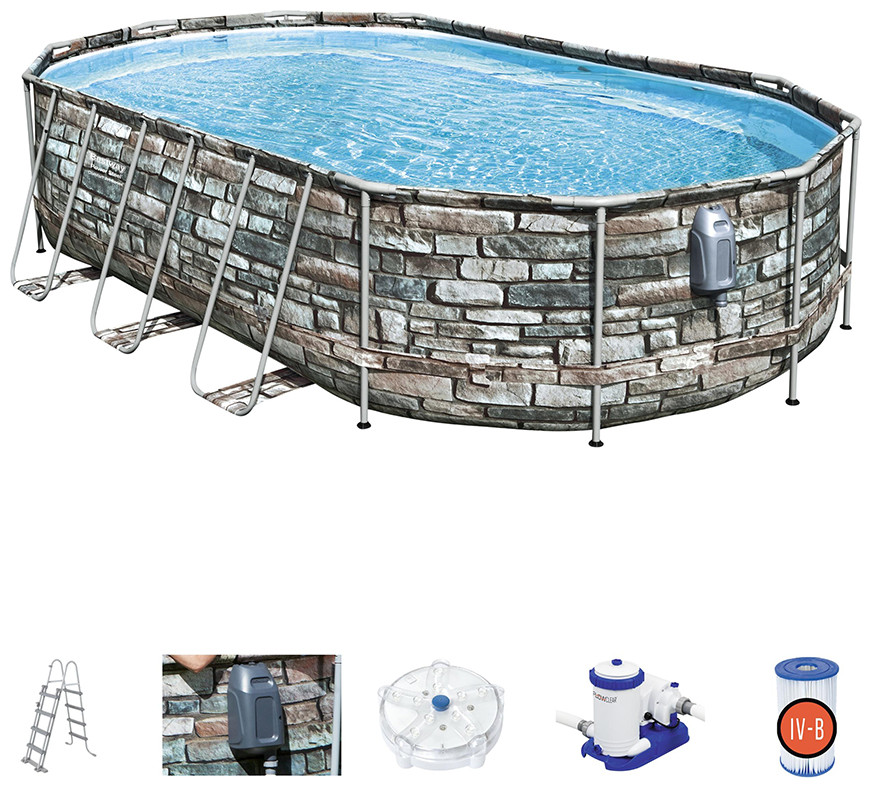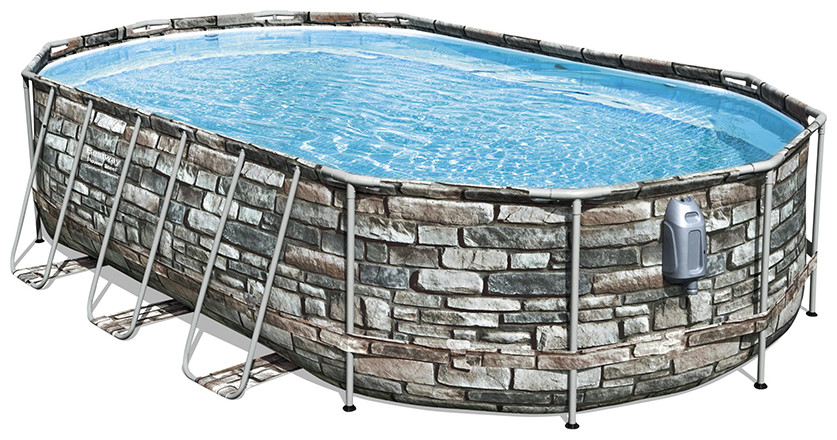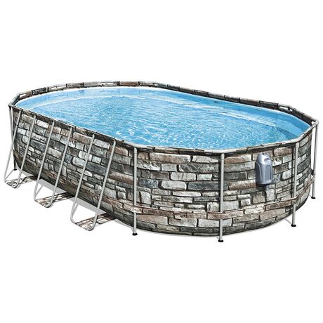 Πισίνα οβάλ με άνετες διαστάσεις 610X366X122 cm για να απολαμβάνεται με άνεση ξέγνοιαστες στιγμές χαλάρωσης και ηρεμίας με την οικογένεια ή την παρέα σας. Είναι κατασκευασμένη από Duraplus 3 στρώσεων από PVC και ειδικό πλέγμα για ενίσχυση για μεγαλύτερη αντοχή στον χρόνο και στην φθορά. Διαθέτει 2 εκτοξευτήρες νερού που κάνουν αναζωογονητικό μασάζ καθώς και φωτισμό led με 7 διαφορετικά χρώματα για να τα αλλάζετε ανάλογα με την διάθεση σας. Εξωτερικά έχει όψη πέτρινου τοίχου που προσδίδει άψογο αισθητικό αποτέλεσμα. Στην συσκευασία περιλαμβάνεται αντλία με φίλτρο 9,463L και σκάλα.