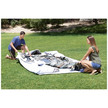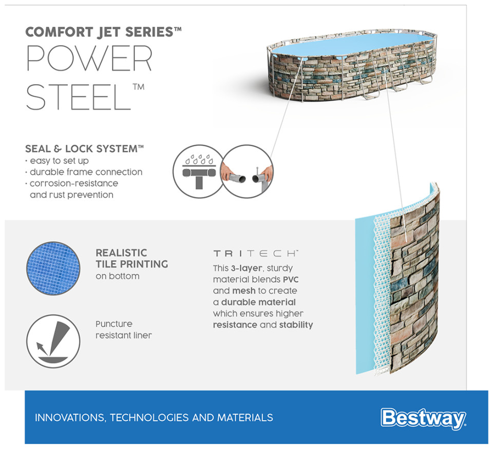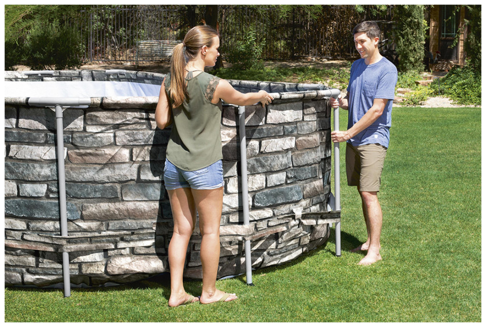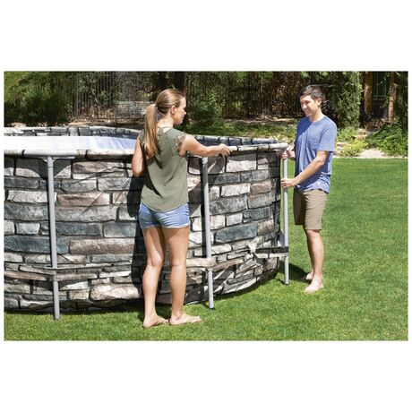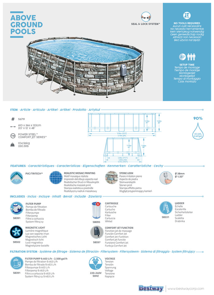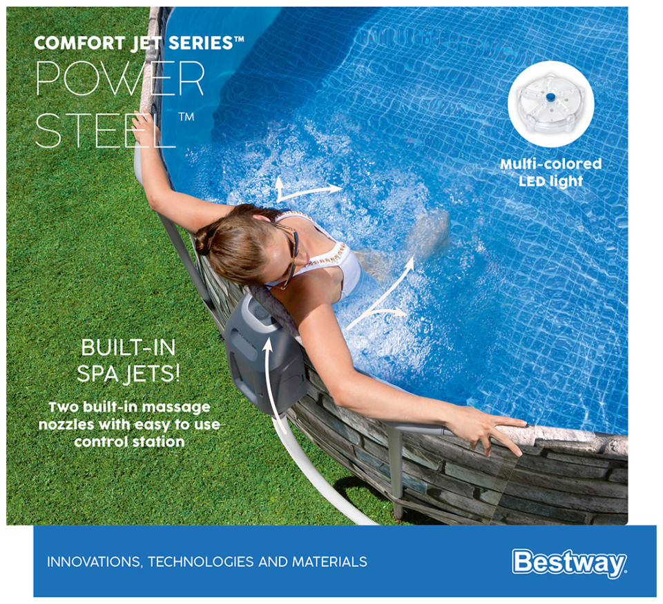Πισίνα οβάλ με άνετες διαστάσεις 610X366X122 cm για να απολαμβάνεται με άνεση ξέγνοιαστες στιγμές χαλάρωσης και ηρεμίας με την οικογένεια ή την παρέα σας. Είναι κατασκευασμένη από Duraplus 3 στρώσεων από PVC και ειδικό πλέγμα για ενίσχυση για μεγαλύτερη αντοχή στον χρόνο και στην φθορά. Διαθέτει 2 εκτοξευτήρες νερού που κάνουν αναζωογονητικό μασάζ καθώς και φωτισμό led με 7 διαφορετικά χρώματα για να τα αλλάζετε ανάλογα με την διάθεση σας. Εξωτερικά έχει όψη πέτρινου τοίχου που προσδίδει άψογο αισθητικό αποτέλεσμα. Στην συσκευασία περιλαμβάνεται αντλία με φίλτρο 9,463L και σκάλα.