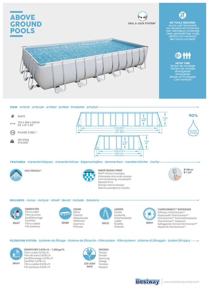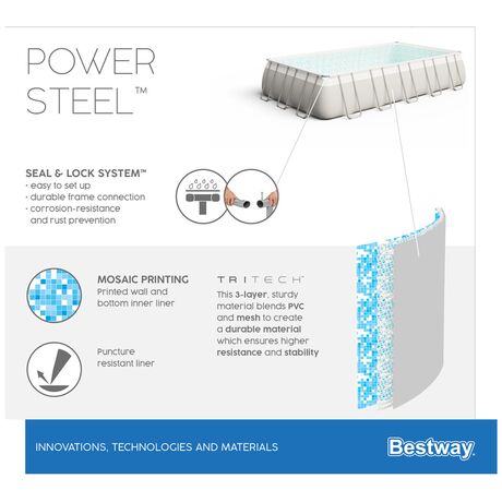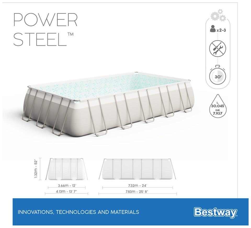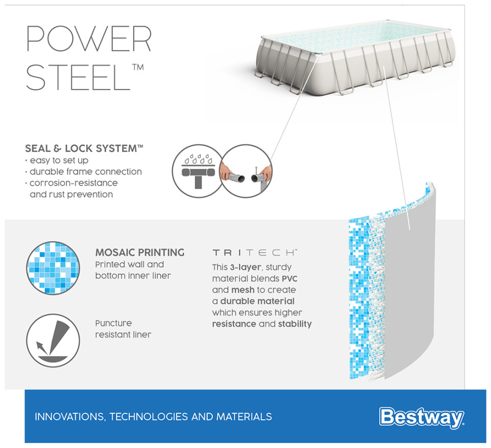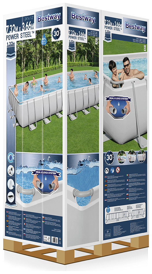 Όταν δεν μπορείτε να δροσιστείτε στην παραλία, μπορείτε στον κήπο σας! Η απίθανη πισίνα BESTWAY, με ατσάλινο εξωτερικό σκελετό και διαστάσεις 7,32x3,66x1,32m, σας το εγγυάται! Είναι φτιαγμένη από το ανώτερης ποιότητας υλικό TriTech™, ένα ενισχυμένο υλικό 3 στρωμάτων με δύο στρώσεις PVC και μία στρώση διχτυού polyester ενδιάμεσα, που προσφέρει εξαιρετική δύναμη και στιβαρότητα, αντέχει στις ακραίες συνθήκες, την υπεριώδη ακτινοβολία και το χλώριο, και έχει πιστοποιηθεί ως προς την αντοχή του στο βάρος και την πίεση που ασκεί μεγάλος όγκος νερού. Διαθέτει φίλτρο, αντλία φίλτρου 220V και σκάλα, κάλυμμα και προστατευτικό εδάφους! Αναμφίβολα, μία ιδανική επιλογή για ένα δροσερό καλοκαίρι στο σπίτι σας!