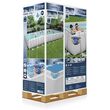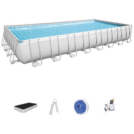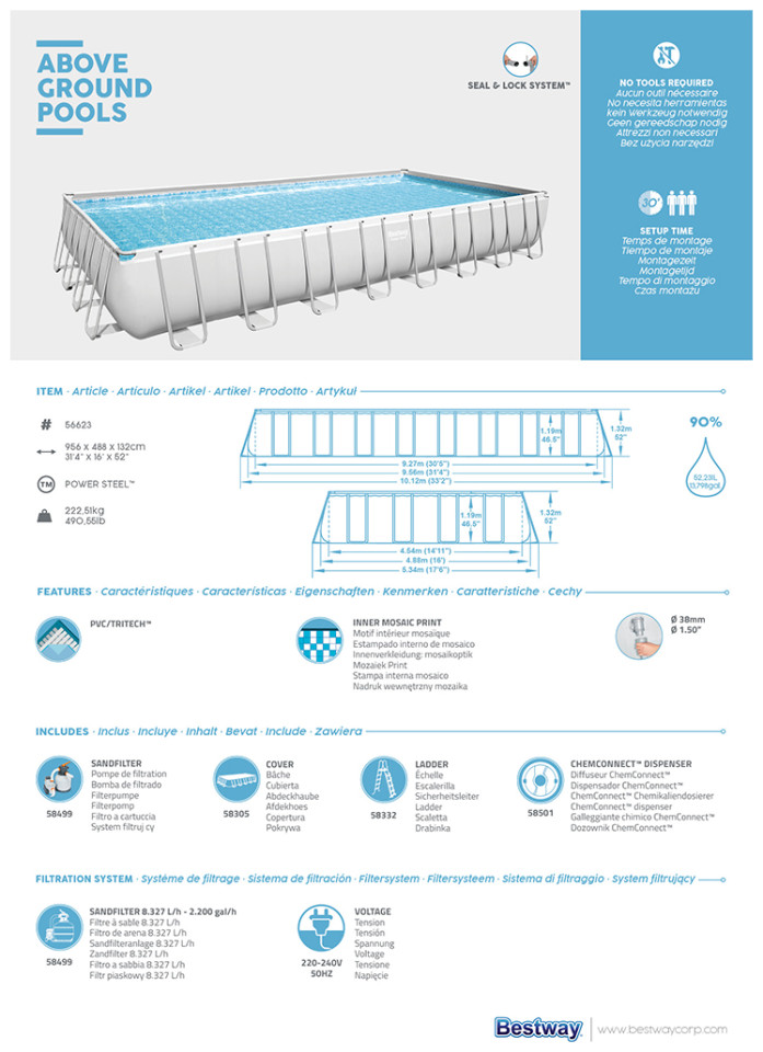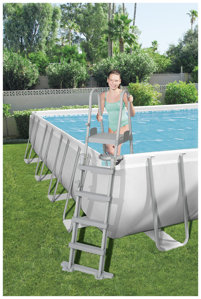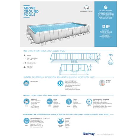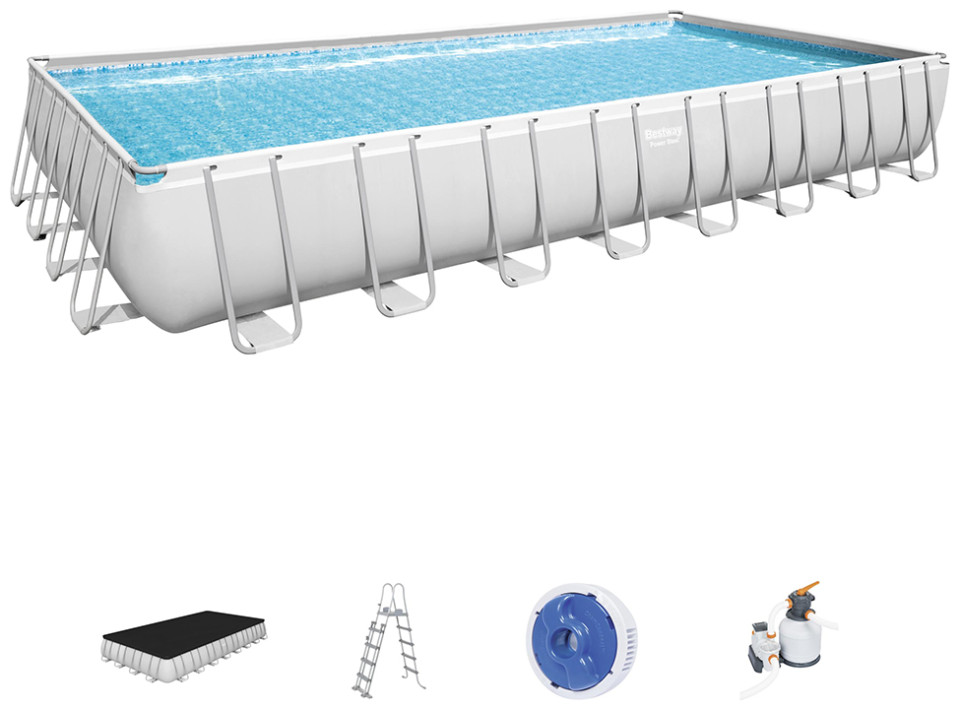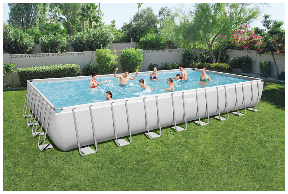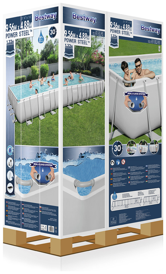 Όταν δεν μπορείτε να δροσιστείτε στην παραλία, μπορείτε στον κήπο σας! Η απίθανη πισίνα BESTWAY, με ατσάλινο εξωτερικό σκελετό, νέα ισχυρότερα οβάλ πόδια και διαστάσεις 9.56 x 4.88 x 1.32m, σας το εγγυάται! Είναι φτιαγμένη από το ανώτερης ποιότητας υλικό TriTech™, ένα ενισχυμένο υλικό 3 στρωμάτων με δύο στρώσεις PVC και μία στρώση διχτυού polyester ενδιάμεσα, που προσφέρει εξαιρετική δύναμη και στιβαρότητα, αντέχει στις ακραίες συνθήκες, την υπεριώδη ακτινοβολία και το χλώριο, και έχει πιστοποιηθεί ως προς την αντοχή του στο βάρος και την πίεση που ασκεί μεγάλος όγκος νερού και με νέο εσωτερικό με εκτύπωση τύπου μωσαϊκού! Διαθέτει βαλβίδα ελεγχόμενης ροής, για εύκολο άδειασμα, φίλτρο άμμου, αντλία φίλτρου 220V(7.571L), σκάλα, κάλυμμα και προστατευτικό εδάφους! Αναμφίβολα, μία ιδανική επιλογή για ένα δροσερό καλοκαίρι στο σπίτι σας!