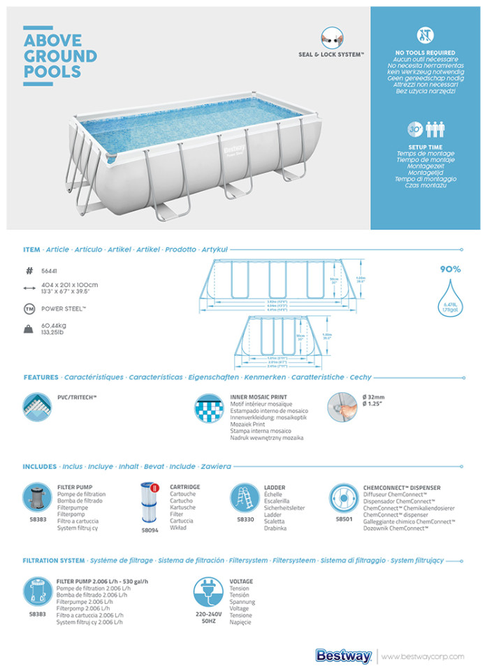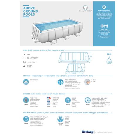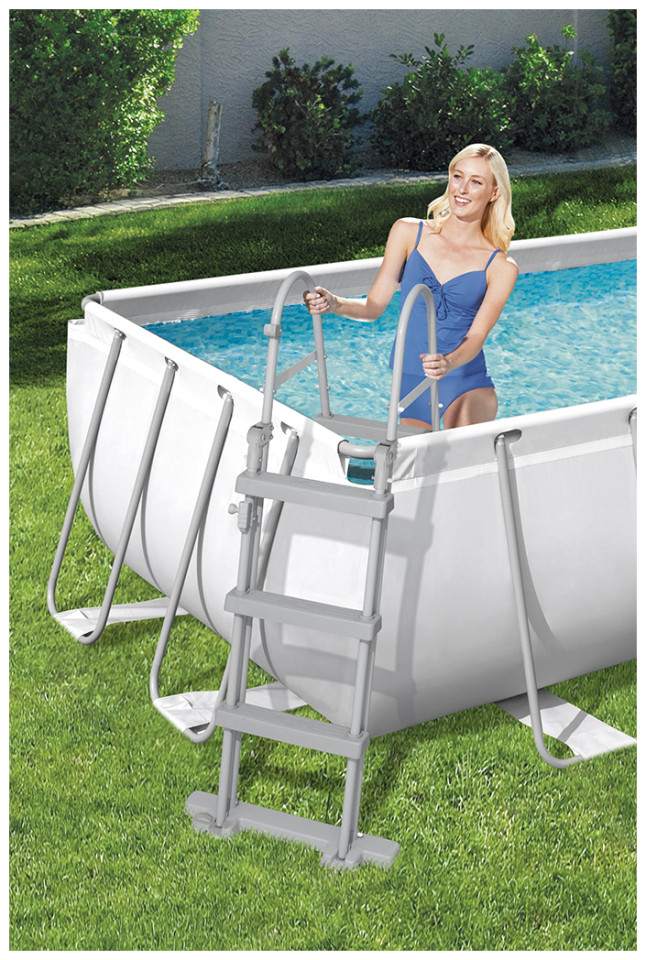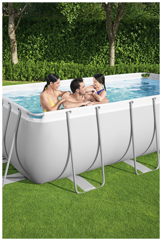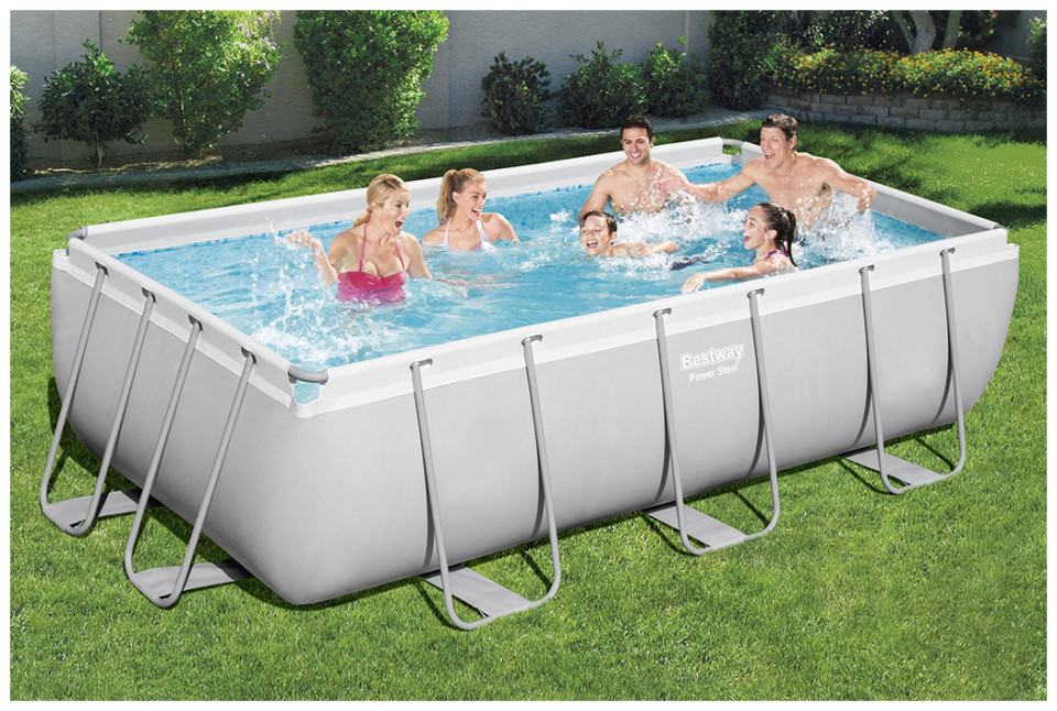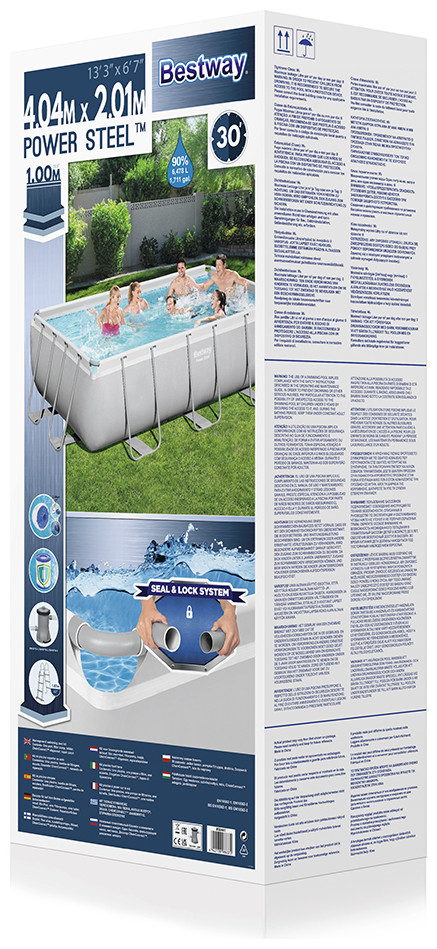 Παραλληλόγραμμη πισίνα της Bestway Power Steel ιδανική για να απολαμβάνεται ξέγνοιαστες στιγμές χαλάρωσης με την παρέα ή την οικογένεια σας και να δροσίζεστε από την καλοκαιρινή ζέστη. Με άνετες διαστάσεις 404x201x100cm και χωρητικότητα 6.478L για μέγιστη άνεση και ασφάλεια καθόλη την διάρκεια χρήσης. Με ατσάλινο πλαίσιο και μεταλλικά κουφώματα για αντοχή στον φθορά και στις εξωτερικές καιρικές συνθήκες. Εξοπλισμένη με το σύστημα Seal & Lock System™ για ανθεκτική και ασφαλή σύνδεση σωλήνων. Στην συσκευασία περιλαμβάνεται 1 αντλία φίλτρου για την σωστή διατήρηση του νερού, η σκάλα για ασφαλή πρόσβαση ανα πάσα στιγμή και 1 χημικό διανομέα ChemConnect για να διατηρεί καθαρό και υγιεινό το νερό της πισίνας παρέχοντας ένα σταθερό επίπεδο χλωρίου που διασκορπίζεται ομοιόμορφα σε όλη την πισίνα.