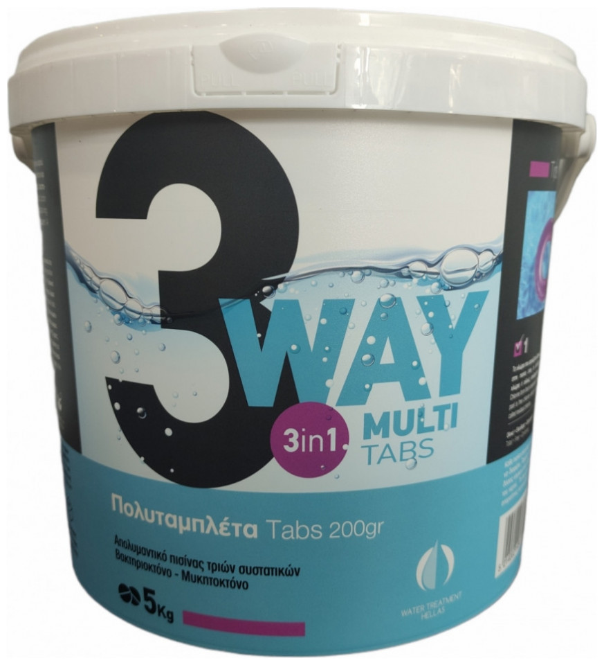 Χλώριο αργής διάλυσης (τριχλωροισοκυανουρικό οξύ), αλγεοκτόνο, κροκιδωτικό, και σταθεροποιητής PH μαζί σε μία ταμπλέτα των 200gr! Οι πολυταμπλέτες 3 σε 1 Water Treatment Hellas απολυμαίνουν το νερό, εμποδίζουν την εμφάνιση των άλγεων, διατηρούν το νερό κρυστάλλινο και διαυγές, και σταθεροποιούν το PH του! Δεν περιέχουν ασβέστιο, δεν προκαλούν επικαθίσεις αλάτων, ώστε να μπλοκάρουν το φίλτρο της πισίνας, και δεν μεταβάλλουν την τιμή του PH του νερού. Τοποθετούνται στο σκίμερ, σε επιπλέον χλωριωτή ταμπλέτας, ή στους ειδικούς πλωτούς διανομείς χημικών καθαριστικών που χρησιμοποιούνται σε όλες τις πισίνες. Αφού έχετε ρυθμίσει το PH του νερού σε τιμές 7.2-7.6, προσθέτετε 1-3 ταμπλέτες κάθε 10 μέρες, με την προτεινόμενη δόση να προσαρμόζεται ανάλογα με το μικροβιακό φορτίο και τις καιρικές συνθήκες και το επίπεδο του υπολειμματικού χλωρίου να διατηρείται οπωσδήποτε μεταξύ 0.5-2 mg/l. Ένα εγκεκριμένο προϊόν, που χάρη στην πολλαπλή ενεργό δράση του συντελεί αποτελεσματικά στη σωστή συντήρηση της πισίνας σας, σκοτώνοντας τα επικίνδυνα για τον άνθρωπο μικρόβια, βακτηρίδια και μύκητες!