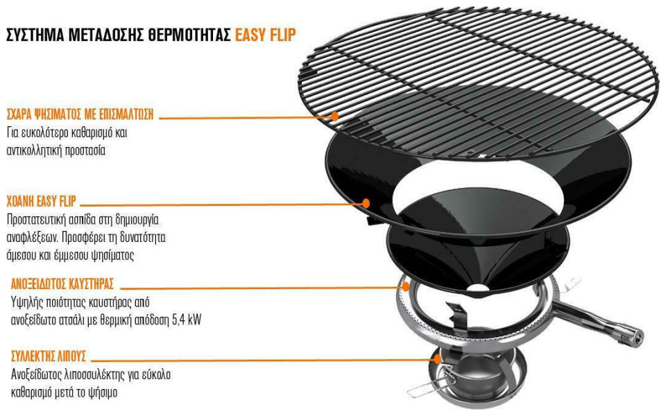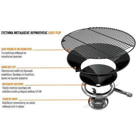 Η ψησταριά υγραερίου Compactchef 480 G της OutdoorChef® είναι η ιδανική επιλογή για αρχάριους και λάτρεις του ψησίματος. Με στρογγυλό σχεδιασμό τύπου Kettle, εξασφαλίζει ομοιόμορφη διάχυση θερμότητας σε όλη την επιφάνεια ψησίματος. Ο πανίσχυρος κυκλικός καυστήρας προσφέρει ισχύ 5.8 kW, ενώ η ρύθμιση θερμοκρασίας κυμαίνεται από 180 έως 340°C, επιτρέποντας σας να ψήνετε τα πάντα, από κρέατα μέχρι πίτσες. Η αντικολλητική σχάρα ψησίματος με σμάλτο πορσελάνης διευκολύνει το καθάρισμα, ενώ το πρωτοποριακό σύστημα χοάνης Easy-Flip σας δίνει τη δυνατότητα για άμεσο και έμμεσο ψήσιμο. Με θερμόμετρο στο καπάκι, μπορείτε να ελέγχετε την θερμοκρασία με ακρίβεια. Οι γάντζοι για τα εργαλεία σας και οι 2 ρόδες διευκολύνουν την αποθήκευση και τη μεταφορά της ψησταριάς. Περιλαμβάνει ρυθμιστή και λάστιχο για σύνδεση με φιάλη 10kg, κάνοντάς την έτοιμη για χρήση.