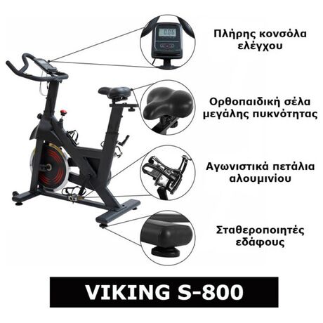 Το Viking S-800 Spin Bike είναι ένα ιδιαίτερα στιβαρό ποδήλατο spinning με μεγάλο δίσκο που θα ικανοποιήσει με την μεγάλη κλιμάκωση αντίστασης, την σταθερότητα και την γενικότερη απόδοση του ακόμα και τον ποιο απαιτητικό χρήστη.O Ρυθμιστής αντίστασης είναι περιστρεφόμενοςκαι η κίνηση του 2 κατευθύνσεων. Η σέλα του είναι κατασκευασμένη από ανατομκό και αεριζόμενο υλικο και είναι ρυθμιζόμενη πάνω-κάτω, εμπρός-πίσω. Διαθέτει ηλεκτρονική κονσόλα με ενδείξεις ταχύτητας, χρόνου, απόστασης, θερμίδων, οδόμετρo, καρδιακών παλμών καθώς και υποδοχή μπουκαλιού για υγρά.Με ρόδες μεταφοράς για εύκολη μεταφορά στον χώρο σας.