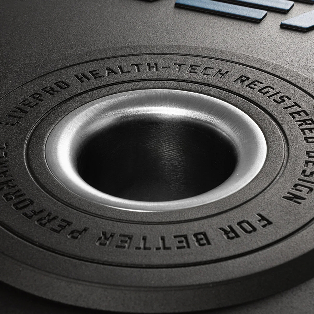 Οι έγχρωμοι δίσκοι προπόνησης από καουτσούκ της Livepro διαμορφώνονται σε υψηλές θερμοκρασίες με νέο τύπου λάστιχου πάχους 24-88mm. Είναι αθόρυβοι και δεν φθείρουν το πάτωμα. Αυτοί οι δίσκοι είναι εξαιρετικά αδιάβροχοι και ανθεκτικοί στη φθορά. Ο εσωτερικός δακτύλιος από ανοξείδωτο χάλυβα είναι εύκολος να τοποθετηθεί και να αφαιρεθεί από μια μπάρα. Πέρασε επιτυχώς χωρίς ζημιές μια αυστηρή δοκιμή πτώσης.