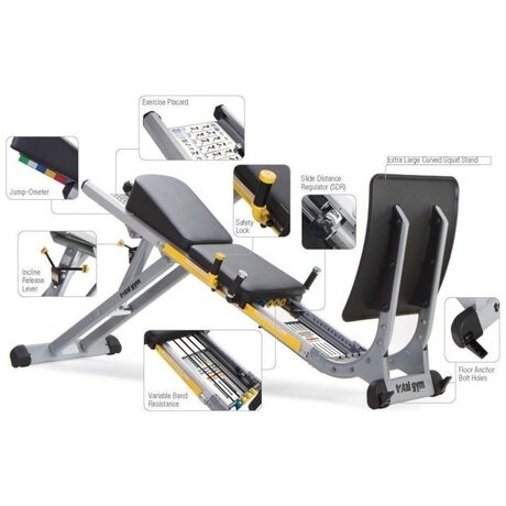 Jump Trainer της Total Gym, αυξάνει την εκρηκτική δύναμη και αναπτύσσει τη μάζα των μυών του κάτω άκρων με δύο βασικές κινήσεις, το βαθύ κάθισμα και το βαθύ κάθισμα με επιτόπιο άλμα. Μοναδικά σχεδιασμένο για να διευκολύνει πλειομετρικές ασκήσεις αξιοποιώντας τόσο τη γραμμική αντίσταση του σωματικού βάρους όσο και τη μεταβλητή των λάστιχων, ασκεί ομόκεντρες και έκκεντρες δυνάμεις στους μύες, επιτρέποντας στους χρήστες να επιταχύνουν ή να επιβραδύνουν γρήγορα κατά τη διάρκεια πηδήματος από βαθύ κάθισμα με έναν ασφαλή και ελεγχόμενο τρόπο. Σχεδιασμένο για όλα τα επίπεδα φυσικής κατάστασης, στηρίζει τη σπονδυλική στήλη στο παραδοσιακό βαθύ κάθισμα, δίνοντας στους προχωρημένους χρήστες τη δυνατότητα εκτέλεσης εξειδικευμένων ασκήσεων. Διαθέτει δύο βασικές ρυθμίσεις: Φυσιοθεραπείας και Άσκησης, κάθε μια με επτά επίπεδα κλίσης, με κλίμακα από 30% μέχρι 80% του βάρους του σώματός σας. Επιπλέον τα τέσσερα λάστιχα σας που υπάρχουν στο μηχάνημα, προσφέρουν πρόσθετη αντίσταση 4,5-32 κιλών, ρυθμιζόμενη σε βήματα των 4,5 κιλών. Υπάρχει αυτόματο φρένο που προστατεύει τις αρθρώσεις κατά τη διάρκεια πλειομετρικών κινήσεων!