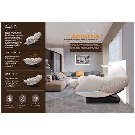 Στη λειτουργία Zero Gravity, υπάρχει μία γωνία κλίσης περίπου 118° μοίρες μεταξύ του σώματος και των ποδιών, η θέση των οποίων είναι υψηλότερα από εκείνη της καρδιάς. Η δύναμη της βαρύτητας από όλο το σώμα μοιράζεται ισομερώς στην πολυθρόνα. Αυτό σας δίνει μία αίσθηση έλλειψης βαρύτητας!
