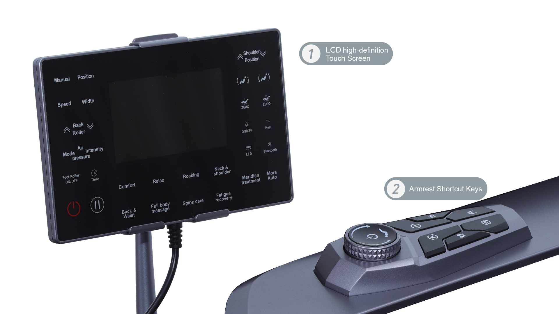 Δύο μέθοδοι λειτουργίας έχουν αναβαθμιστεί σε αυτήν την πολυθρόνα μασάζ. Η μεγάλη οθόνη LCD παρουσιάζει τις κύριες λειτουργίες πιο καθαρά από ένα χειριστήριο χειρός. Είναι λεπτομερής, προσφέρει πολλές πληροφορίες, περιστρέφεται εύκολα, έχει ευκρινή απεικόνιση και επιτρέπει γρήγορο και αποτελεσματικό χειρισμό.
