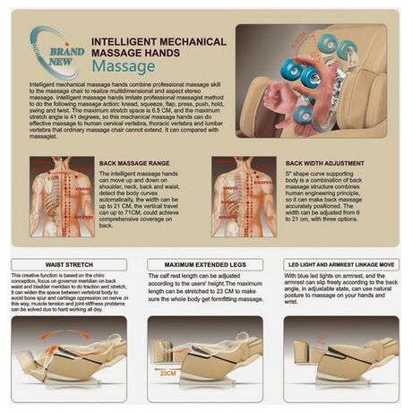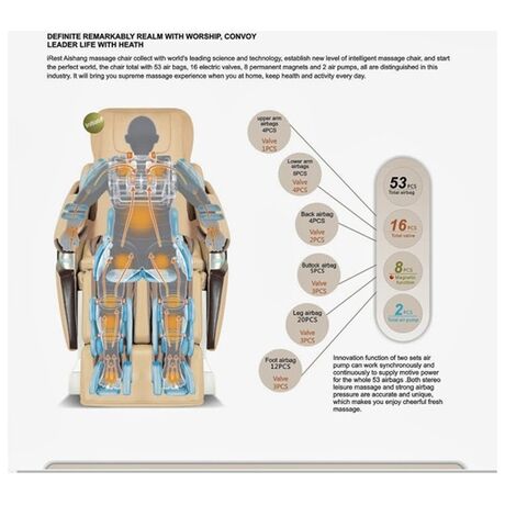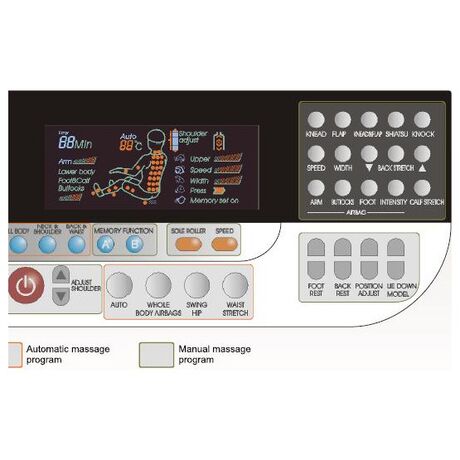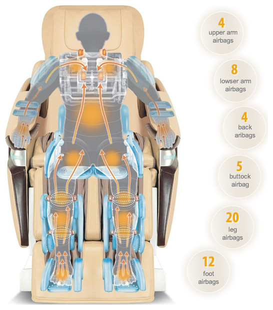 Παρέχει 5 τύπους μασάζ: Siatsu, Kneading, Flapping, Knocking και Kneading/flapping συγχρόνως. Zero Gravity Αισθητήρες ανίχνευσης των διαστάσεων του σώματος και της θέσης των ώμων του χρήστη για βέλτιστη προσαρμογή του μασάζ για το άνω μέρος του σώματος. Αυτόματο μασάζ για το άνω σώμα (Υπάρχουν τρεις προαιρετικοί τρόποι για τον ώμο και τον αυχένα, την πλάτη και την μέση με 3 επιμέρους επιλογές: ολικό, μερικό και επικεντρωμένο μασάζ). Για κάθε είδος μασάζ υπάρχουν 5 επιλογές ταχύτητας. Εξοπλισμένη με 8 αυτόματα προγράμματα και μνήμες που "θυμούνται" το αγαπημένο σας είδος μασάζ. Το πλάτος (απόσταση) μεταξύ των κεφαλών μασάζ μπορεί να ρυθμιστεί σε 3 επίπεδα. Για το μασάζ με τους αερόσακους υπάρχουν 3 επιλογές ρύθμισης: για όλο το σώμα, για το κάτω μέρος του σώματος (γάμπες-πέλματα), ή για τους βραχίονες. Ρύθμιση της πίεσης των αερόσακων σε 3 επίπεδα έντασης. L-shape μασάζ με αερόσακους στους βραχίονες. Λειτουργία έλξης αρθρώσεων (arthrosis traction). Λειτουργία διάτασης-αποσυμπίεσης της μέσης. Θεραπεία με 8 μαγνήτες. Έγχρωμη οθόνη υψηλής τεχνολογίας VFD Φωτισμός LED, λειτουργία ανάκλισης του υποποδίου σε διάφορες θέσεις. Επίσης το υποπόδιο μπορεί να προσαρμοστεί σε μήκος (αυξομείωση έως 23 εκατοστά) για άτομα διαφορετικού ύψους Η πλάτη της πολυθρόνας, το υποπόδιο και οι κεφαλές μασάζ επανέρχονται αυτόματα στις αρχικές τους θέσεις όταν απενεργοποιήσουμε την πολυθρόνα.