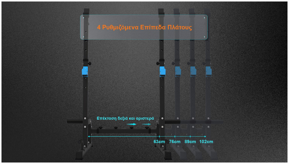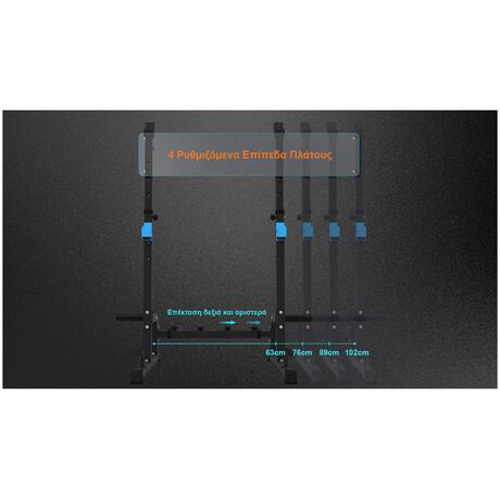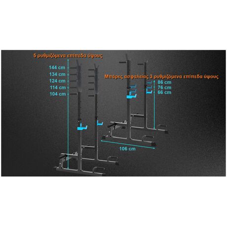 Ανθεκτικοί και αξιόπιστοι, οι Ορθοστάτες Pegasus® JX-855 προσφέρουν ασφάλεια και σιγουριά κατά την εκτέλεση ενός τεράστιου αριθμού ασκήσεων με βάρη. Μπορείτε πολύ εύκολα να ρυθμίσετε κατά ύψος όχι μόνο τη θέση των ορθοστατών σε 5 θέσεις, αλλά και τα στοπ ασφαλείας για την μπάρα σας σε 3 θέσεις, έτσι ώστε να φέρετε την προπόνηση στα μέτρα σας. Ρυθμίστε το εύρος των ορθοστατών σε 4 διαφορετικές θέσεις ανάλογα με το σωματότυπο σας και την μπάρα που χρησιμοποιείτε. Το εσωτερικό εύρος της μπάρας που είναι συμβατή με τους ορθοστάτες κυμαίνεται μεταξύ 73.5 cm και 120.5 cm. Εκτελέστε τη δημοφιλή άσκηση βυθίσεων χάρη στις δύο ενσωματωμένες λαβές στο πίσω μέρος των ορθοστατών. Στο μπροστινό μέρος θα βρείτε 2 λαβές για να εκτελέσετε ασκήσεις push up. Σε κάθε πλευρά των ορθοστατών υπάρχει μία υποδοχή όπου μπορείτε να αποθηκεύσετε δίσκους βάρους ώστε να κρατάτε το χώρο σας τακτοποιημένο. Συνδυάστε τους ορθοστάτες σας με έναν από τους πάγκους μας και αποκτήστε πρόσβαση σε ακόμη περισσότερες ασκήσεις με ελεύθερα βάρη ή χωρίς βάρη.