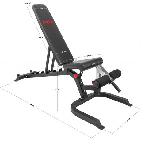 Ρυθμιζόμενος Πάγκος Γυμναστικής της Amila 43968 ιδανική επιλογή για να ικανοποιήσει και τους πιο απαιτητικούς οικιακούς χρήστες. Έχετε τη δυνατότητα να ρυθμίσετε την πλάτη σε έξι θέσης, το κάθισμα και το στήριγμα ποδιών σε τέσσερις επομένως μπορείτε να στοχεύσετε συγκεκριμένους μύες ώστε να ολοκληρώσετε ένα πλήρες πρόγραμμα προπόνησης χωρίς κανένα περιορισμό Τα μαξιλάρια στήριξης για τα πόδια είναι εξαιρετικά για επιπλέον υποστήριξη κατά την εκτέλεση ασκήσεων υπό γωνία. Ο συγκεκριμένος πάγκος είναι ιδιαίτερα σταθερός χάρη στην μεγάλη επιφάνια στήριξης που διαθέτει η βάση του 173 x 65cm για να βελτιώσει την σταθερότητα του. Άνετο κάθισμα και μαξιλάρι πλάτης και ένα σύνολο που θα σας προσφέρει αντοχή έως 250 κιλών.