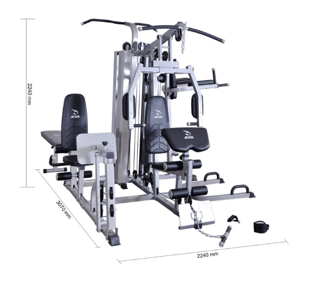 Το Πολυόργανο Πολλαπλών Θέσεων JK-1600 της Pegasus, είναι ένας σταθμός εκγύμνασης, έξυπνου σχεδιασμού, που παρέχει τη δυνατότητα ταυτόχρονης άσκησης έως 5 ατόμων! Περιλαμβάνει 2 σειρές βάρους σε πλάκες από ατσάλι 70 κιλών η καθεμία, με μεταλλικά περιβλήματα για την ασφάλεια σας. Επιπλέον διαθέτει σταθμούς για όλο το σώμα, πρέσας ποδιών, μονόζυγο, δίζυγο, λαβές βυθίσεων και ένα ρυθμιζόμενο πάγκο! Εκτελέστε ένα τεράστιο πλήθος ασκήσεων με το πολυμηχάνημα γυμναστικής της Pegasus, κάποιες ενδεικτικές ασκήσεις είναι οι πιέσεις στήθους, εκτάσεις στήθους, χαμηλή κωπηλατική, κάμψεις δικεφάλων χεριών, πιέσεις τρικεφάλων, πιέσεις ώμων, οριζόντιες πιέσεις ποδιών και γαμπών, βυθίσεις, Push ups, πιέσεις αλτήρων σε ίσιο πάγκο! Η ενσωματωμένη πρέσα ποδιών είναι πλήρως προσαρμόσιμη για ασκούμενους κάθε ύψους και περιλαμβάνει αντιολισθητική βάση για μεγαλύτερη ασφάλεια κατά την εκτέλεση της άσκησης. Συνδέεται με τα κεντρικά βάρη του συστήματος μέσω ισχυρών συρματόσχοινων! Επίσης διαθέτει ισχυρά ελατήρια τα οποία είναι τοποθετημένα κάτω από τις ενσωματωμένες πλάκες, ώστε να απορροφήσουν τυχόν απότομη πτώση των βαρών. Τα ισχυρά συρματόσχοινα αεροπορικού τύπου σας δίνουν την δυνατότητα έλξης έως 900 kg!
