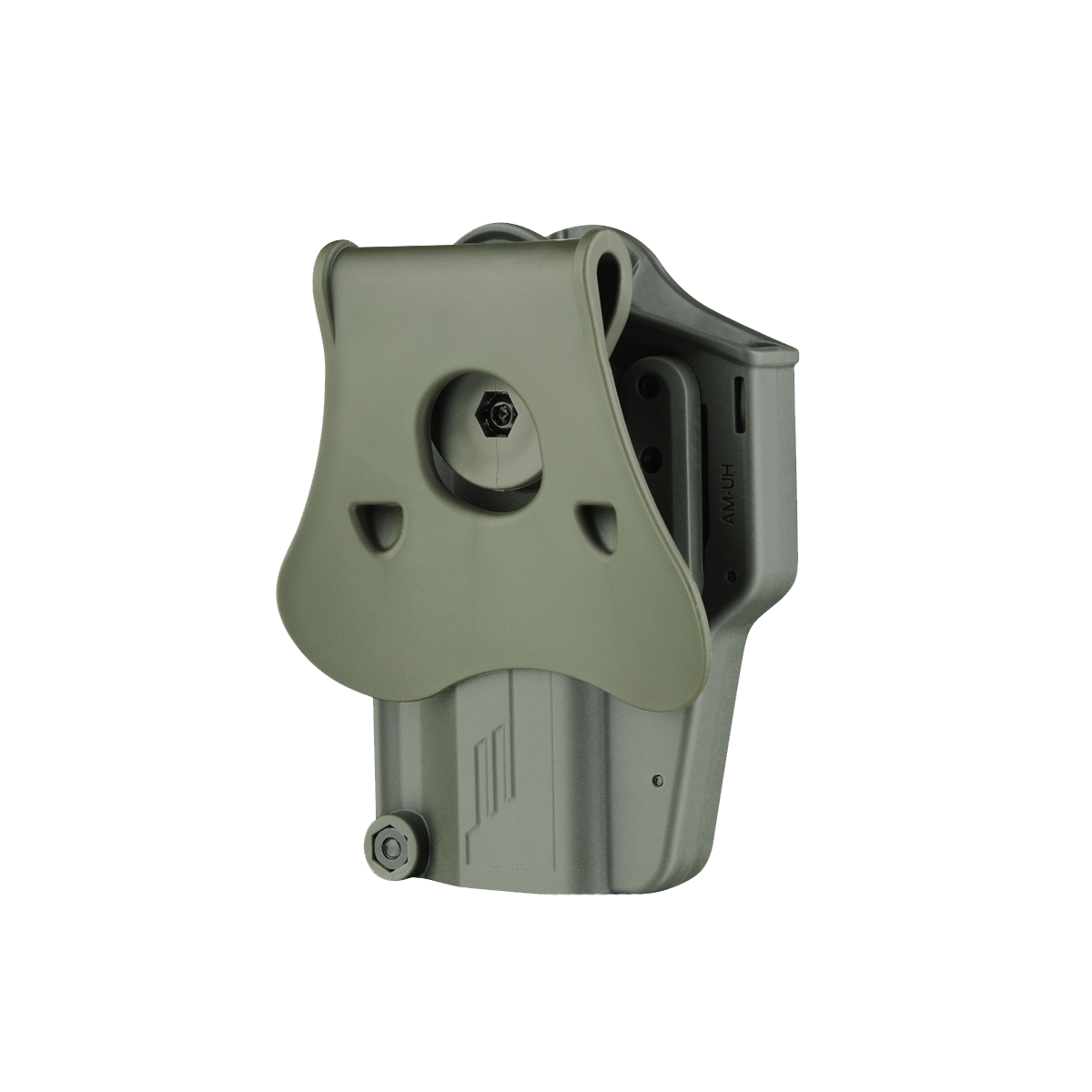 Θήκη Πιστολιού Amomax Per-Fit Universal συμβατή με περισσότερα από 80 airsoft ή πραγματικά πιστόλια, όπως Glock, Sig Sauer, CZ, Ruger, Springfield Armory, Beretta, Smith & Wesson, σειρά 1911 κ.λπ. Η κλασική απελευθέρωση με το δάχτυλο παρέχει ασφαλή συγκράτηση. Γραμμωτό φινίρισμα έχει προστεθεί στο κουμπί απελευθέρωσης, παρέχοντας πολύ καλή, επιχειρησιακή αίσθηση. Με 3 εύκολα βήματα ρυθμίζετε την θήκη ανάλογα με το μέγεθος του πιστολιού σας. Η θήκη Per-Fit είναι συμβατή με 4 διαφορετικές πλατφόρμες μεταφοράς – κουπί (στάνταρ), κλιπ ζώνης, MOLLE και πλατφόρμα μηρού. Το σώμα της θήκης περιστρέφεται 360 μοίρες. Οι χρήστες μπορούν εύκολα να προσαρμόσουν τη θέση μεταφοράς.