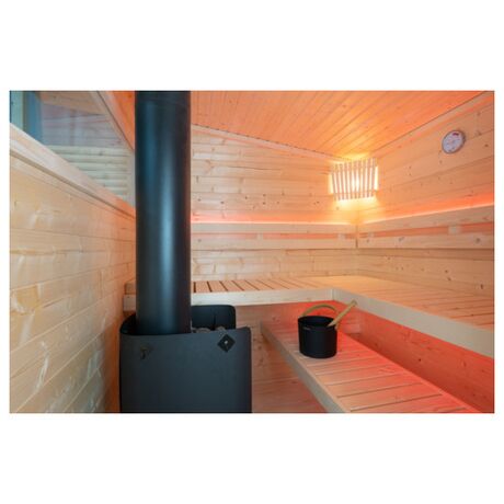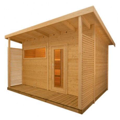 Η σάουνα Scala-L της Sentiotec είναι κατάλληλη για εξωτερικό χώρο με χωρητικότητα 5 ατόμων! Πρόκειται για μια εξαιρετική σάουνα με δικό της στεγασμένο μπαλκονάκι, πλαίσιο στα πλαϊνά του το οποίο προσφέρει διακριτικότητα ενώ μπορείτε να τοποθετήσετε πάγκο ή ξαπλώστρα εφόσον το επιθυμείτε για ακόμη μεγαλύτερη χαλάρωση και εσωτερικά έχει προθάλαμο! Εσωτερικά υπάρχει πόρτα με υαλοπίνακα και ξύλινο χερούλι η οποία διαχωρίζει τον προθάλαμο από την αίθουσα σάουνας έτσι ώστε κατά την είσοδό σας ή την έξοδό σας να μην υπάρχουν απώλειες θερμότητας. Η οροφή περιμετρικά διαθέτει προεξοχή 30cm κατευθύνοντας τα νερά της βροχής στον περιβάλλοντα χώρο ενώ το μπαλκόνι διαθέτει άνετο στέγαστρο φάρδους 80cm. Κατασκευασμένη από ατόφιο και συμπαγή ξύλο ερυθρελάτης πάχους 40mm με διπλή αυλάκωση για καλύτερη εφαρμογή και συνδεσιμότητα ενώ το δάπεδο είναι πάχους 19mm. Η εξωτερική πόρτα διαθέτει κλειδαριά και είναι κατασκευασμένη επίσης από ερυθρελάτη και θερμομονωτικό υαλοπίνακα με τα ESG στάνταρ με βιώσιμες περιβαλλοντικές πρακτικές όπως και το παράθυρο.