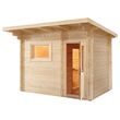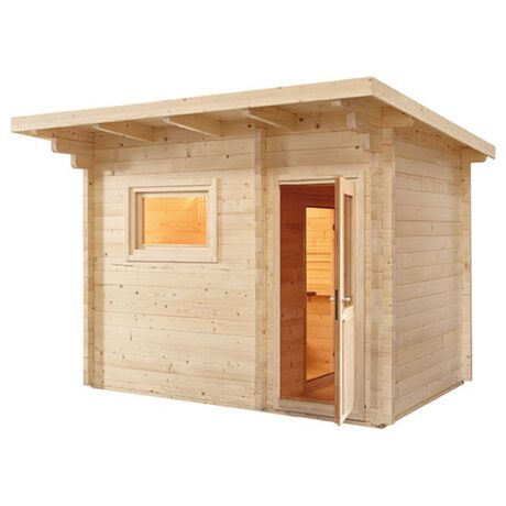 Τα εσωτερικά στοιχεία όπως οι πάγκοι, τα προσκέφαλα, οι πλάτες και η προστασία της λάμπας είναι από ξύλο φλαμουριάς το οποίο είναι άοσμο, δεν έχει ευθραυστότητα και δεν εκλύει ερεθιστικά εκχυλίσματα. Οι 3 πάγκοι μεγάλων διαστάσεων με τους οποίους είναι εξοπλισμένη η σάουνα αυτή είναι ικανοί να φιλοξενήσουν έως 5 άτομα. Στην οροφή διαθέτει φωτιστικό (η λάμπα δεν περιλαμβάνεται) με προστατευτική γρίλια μπροστά. Η στέγη διαθέτει μόνωση με πισσόχαρτο και τα απαραίτητα υλικά για την εγκατάσταση.