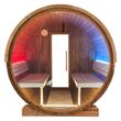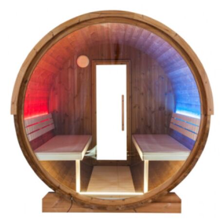 Η σάουνα Kaski τύπου βαρέλι της Sentiotec είναι κατάλληλη για εξωτερικό χώρο με χωρητικότητα 4-6 ατόμων! Η οροφή διαθέτει ασφαλτόπανο, για μόνωση και προστασία από την βροχή, με σχέδιο πέτρας. Πρόκειται για μια εξαιρετική σάουνα κατασκευασμένη από ατόφιο και συμπαγή ξύλο πεύκου πάχους 40mm με ειδική θερμική επεξεργασία καθιστώντας το ξύλο πολύ ανθεκτικό και κατάλληλο για εξωτερική χρήση. Το σχήμα του βαρελιού προσφέρει μια ευχάριστη ατμόσφαιρα και σε συνδυασμό με την πανοραμική θέα που προσφέρει σας υπόσχεται απόλυτη χαλάρωση σε ένα ιδιαίτερα άνετο περιβάλλον! Στην μια πλευρά του βαρελιού υπάρχει πόρτα η οποία είναι από γυαλί ασφαλείας 8mm, κατασκευασμένη με τα ESG στάνταρ με βιώσιμες περιβαλλοντικές πρακτικές και στην άλλη πλευρά γυαλί ασφαλείας σε ολόκληρη την επιφάνεια της το οποίο σας προσφέρει πανοραμική θέαση.