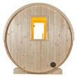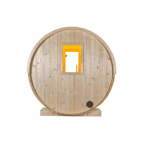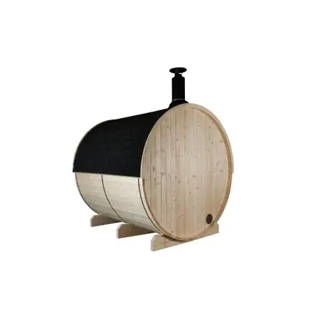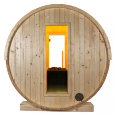 Η σάουνα Kuusi τύπου βαρέλι της Sentiotec είναι κατάλληλη για εξωτερικό χώρο με χωρητικότητα 4-6 ατόμων! Η οροφή διαθέτει ασφαλτόπανο, για μόνωση και προστασία από την βροχή, με σχέδιο πέτρας. Πρόκειται για μια εξαιρετική σάουνα κατασκευασμένη από ατόφιο και συμπαγή ξύλο έλατου πάχους 40mm με ειδική θερμική επεξεργασία καθιστώντας το ξύλο πολύ ανθεκτικό και κατάλληλο για εξωτερική χρήση. Το σχήμα του βαρελιού προσφέρει μια ευχάριστη ατμόσφαιρα και σας υπόσχεται απόλυτη χαλάρωση σε ένα ιδιαίτερα άνετο περιβάλλον! Στην μπροστινή πλευρά του βαρελιού υπάρχει πόρτα η οποία είναι από γυαλί ασφαλείας 8mm, κατασκευασμένη με τα ESG στάνταρ με βιώσιμες περιβαλλοντικές πρακτικές ενώ η πίσω πλευρά είναι κλειστή.
