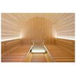Τα εσωτερικά στοιχεία όπως οι πάγκοι, το δάπεδο, οι πλάτες είναι από ξύλο φλαμουριάς το οποίο είναι άοσμο, δεν έχει ευθραυστότητα και δεν εκλύει ερεθιστικά εκχυλίσματα. Οι 2 πάγκοι μεγάλων διαστάσεων 189cm με τους οποίους είναι εξοπλισμένη η σάουνα αυτή είναι ικανοί να φιλοξενήσουν έως 6 άτομα. Στις πλάτες των πάγκων υπάρχει φωτισμός με λευκή LED μπάρα των 76cm με δυνατότητα ρύθμισης της έντασης. Η ανανέωση του αέρα γίνεται μέσω των 2 αεραγωγών οι οποίοι βρίσκονται ο ένας στο πλάι του πάνω μέρους της πόρτας και ο άλλος στο κάτω μέρος πίσω από την θερμάστρα. Προαιρετικά εφόσον το επιθυμείτε υπάρχει η δυνατότητα εγκατάστασης LED έγχρωμου φωτισμού και η επιλογή ανάμεσα σε μικρό ή μεγάλο παράθυρο. Σας παρέχονται επίσης τα απαραίτητα υλικά για την εγκατάσταση.
