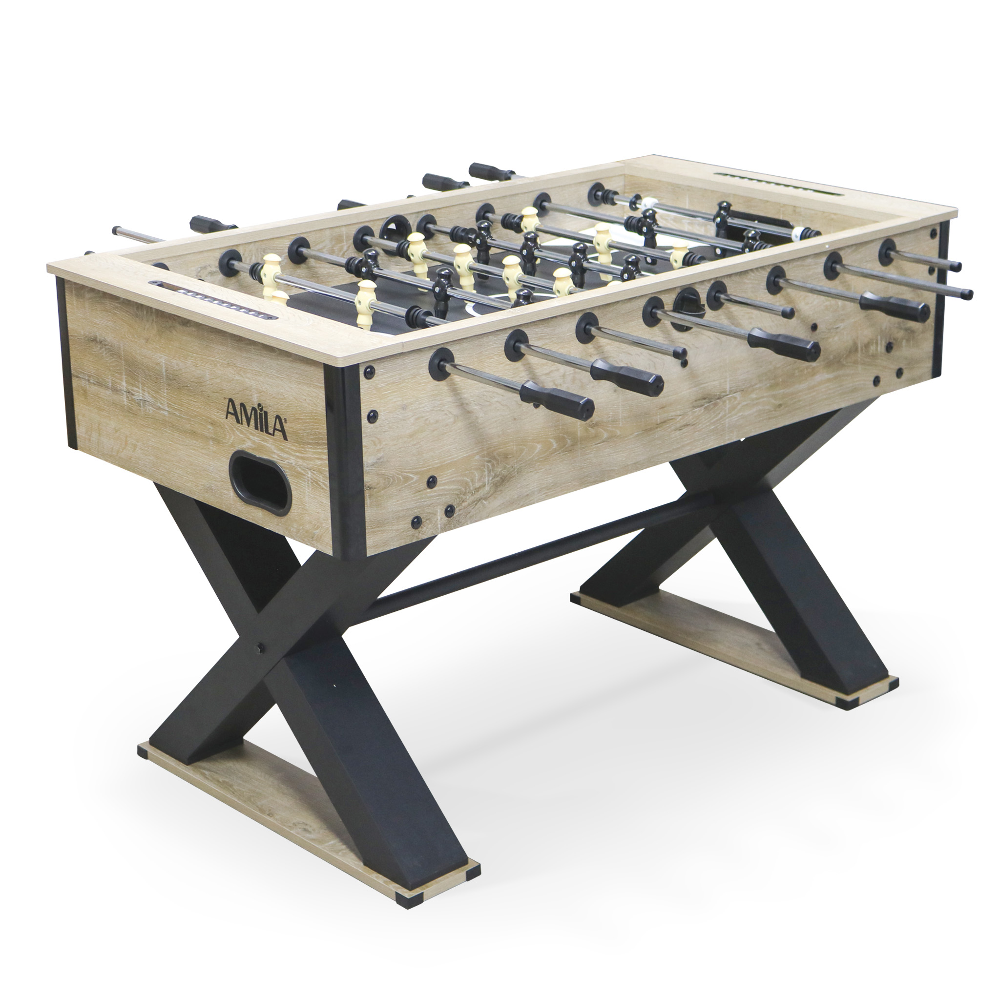 Απολαύστε ανεπανάληπτους αγώνες αναμέτρησης με τους φίλους ή τα παιδιά σας με το επιτραπέζιο ποδοσφαιράκι της Amila ST750. Το προϊόν διαθέτει στιβαρή κατασκευή από PB με επικάλυψη PVC και μπορεί να τοποθετηθεί επιδαπέδια, για να σας χαρίσει αμέτρητες στιγμές διασκέδασης στο σπίτι. Διαθέτει 2 μπάλες μεγάλου μεγέθους, οι οποίες εισάγονται μέσω υποδοχών που ενσωματώνονται σε κάθε πλευρική ποδιά, ενώ εξέρχονται από εσωτερικούς επιστροφείς που είναι τοποθετημένοι σε κάθε πλευρική ποδιά. Για να σας προσφέρει άνεση κατά το παιχνίδι, διαθέτει ράβδους παικτών από χρωμιομένο ατσάλι διαμέτρου 15.8 mm και οριζόντια μπάρα σταθεροποίησης στα πόδια, με μαύρη ηλεκτροστατική βαφή, διαμέτρου 32mm. Ο μετρητής του είναι χειροκίνητος και κατασκευασμένος από πλαστικό, ενώ ενσωματώνονται τριβείς ολίσθησης. Συνολικά το τραπέζι έχει διαστάσεις 137x74x89 cm, ενώ διαθέτει επιφάνεια γηπέδου 117x68.5 cm. Πρόκειται για μια ιδανική επιλογή, που θα σας προσφέρει ατελείωτες ώρες παιχνιδιού στο σπίτι.