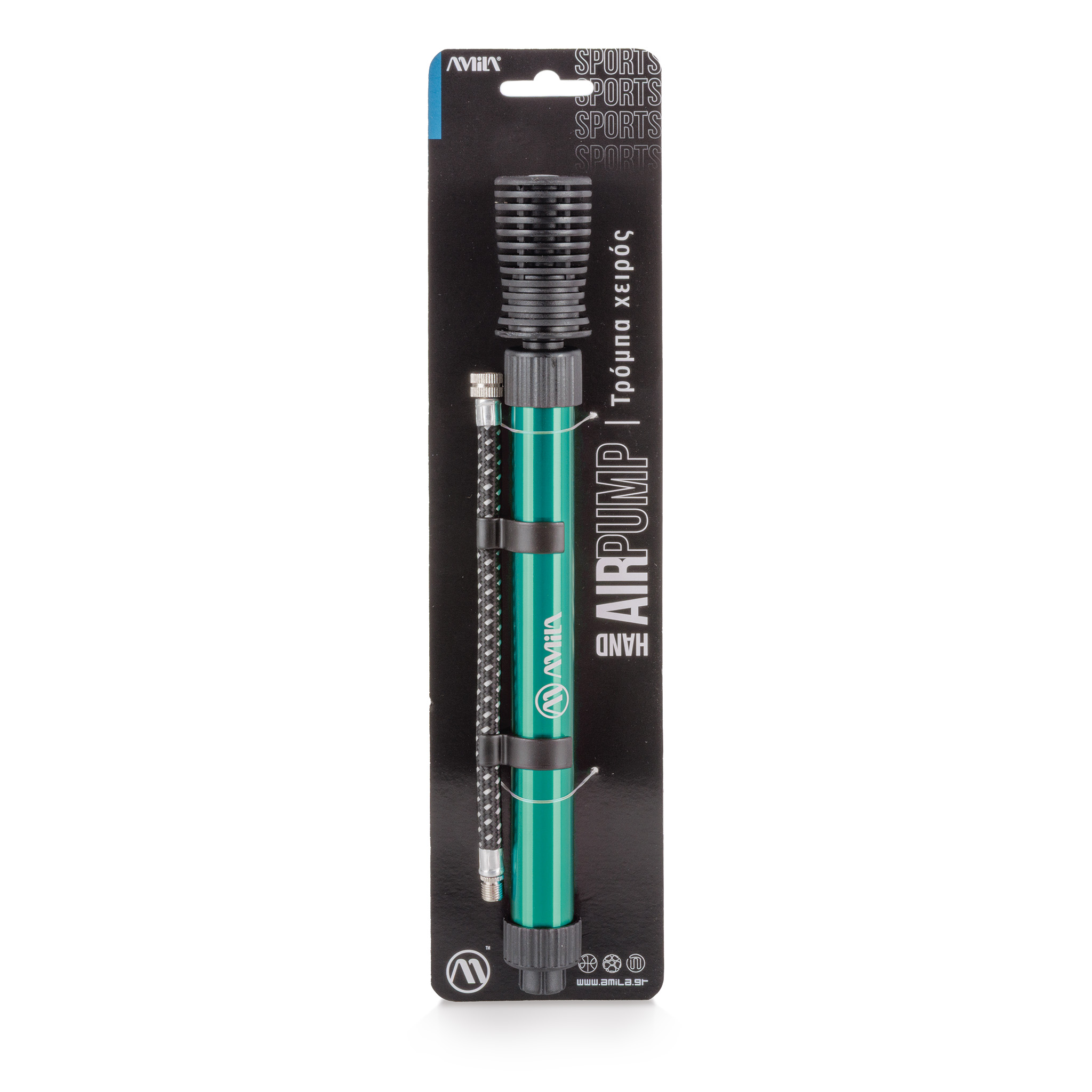 Τρόμπα χειρός από την AMILA διπλής ενέργειας για γρήγορο φούσκωμα μπαλών. Η χωρητικότητα του αέρα, σε κύκλο διπλής ενέργειας φθάνει τα 55cc ενώ η πίεση φθάνει τα 40 psi. Ιδανική σε μέγεθος 25,7 εκατοστών μπορείτε να την έχετε πραγματικά παντού μαζί σας. Περιλαμβάνει μία μεταλλική μύτη για μπάλες. Τέλος για ακόμα μεγαλύτερη ευκολία περιλαμβάνει και λάστιχο επέκτασης.