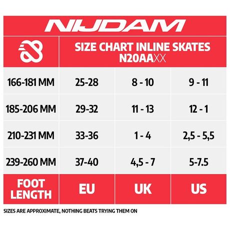 Ρυθμιζόμενα Inline Skates της Nijdam ιδανική επιλογή για δώρο σε ένα αγαπημένο σας άτομο, το οποίο λατρεύει τις βόλτες. Ο στιβαρός σχεδιασμός hardboot παρέχει επαρκή υποστήριξη στο πόδι και στον αστράγαλο και είναι ιδιαίτερα ανθεκτικός. Μάθετε νέα κόλπα και απολαύστε μακρινές βόλτες ή αγώνες ταχύτητες με την παρέα. Ό, τι και αν κάνετε, τα Inline Rollers είναι αρκετά ευέλικτα για να ανταποκριθούν στις απαιτήσεις σας! Απλά πιέζοντας ένα κουμπί στο πίσω μέρος, το μέγεθος της μπότας ρυθμίζεται σε 4 διαφορετικά μεγέθη, έτσι ώστε τα πατίνια σας να σας συντροφεύουν για χρόνια! Οι διαθέσιμες επιλογές είναι 25-28, 29-32, 33-36 και 37-40.