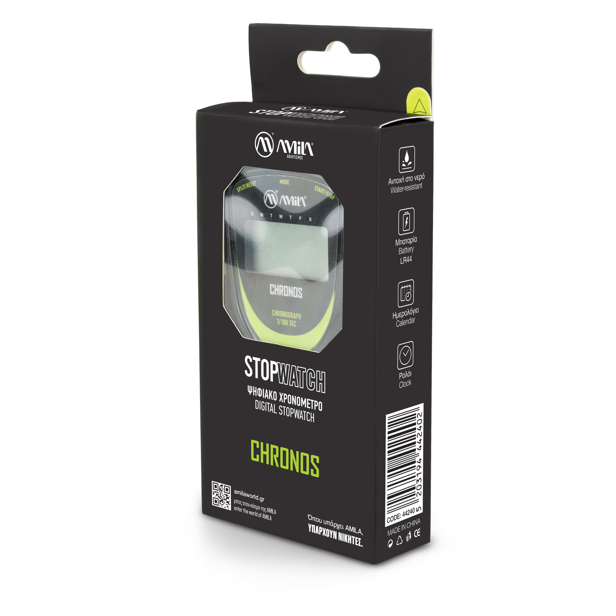 Το Ψηφιακό Χρονόμετρο Chronos Κωδ.44240 είναι ο ιδανικός σύντροφος για κάθε αθλητική δραστηριότητα ή καθημερινή χρήση. Με βάρος μόλις 0.072 κιλά, είναι ελαφρύ και εύκολο στη μεταφορά. Το χρονόμετρο διαθέτει δυνατότητα μέτρησης γύρων, με δύο μνήμες για να αποθηκεύετε τις καλύτερες επιδόσεις σας. Η λειτουργία του είναι απλή και κατανοητή, με επιλογές για 12/24 ωρη μορφή και ημερολόγιο. Επιπλέον, περιλαμβάνει alarm και snooze για να σας ξυπνάει ή να σας υπενθυμίζει σημαντικά γεγονότα. Αν και δεν διαθέτει οπίσθιο φωτισμό ή δυνατότητα αντίστροφης μέτρησης, η αξιοπιστία και η ευκολία χρήσης του το καθιστούν απαραίτητο εργαλείο για κάθε αθλητή ή λάτρη του χρόνου. Το χρονόμετρο λειτουργεί με μπαταρία LR44, εξασφαλίζοντας μακροχρόνια χρήση χωρίς ανησυχίες για την τροφοδοσία του.