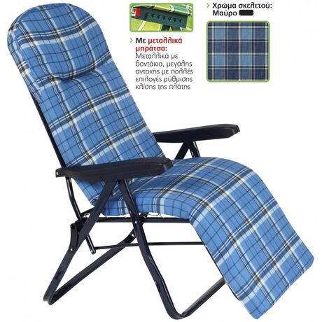 Πολυθρόνα 6 θέσεων Escape 15534 ιδανική για χρήση στο σπίτι, στην αυλή ή στο μπαλκόνι αλλά και σαν καρέκλα νοσοκομειακού συνοδού νοσοκομείου. Το βάρος της σας επιτρέπει να την μεταφέρετε όπου εσείς επιθυμείτε και να ξαπλώσετε άνετα. Συμπεριλαμβάνει μαλακό μαξιλάρι 7 εκατοστών καθώς και προσκέφαλο 26x11cm. Η πολυθρόνα είναι κατασκευασμένη με οκτάγωνο σκελετό 36x20 χιλιοστών ιδιαίτερης αντοχής! Τα μπράτσα της είναι μεταλλικά με δοντάκια για πολύ μεγάλη αντοχή για σιγουριά κατά την αλλαγή των θέσεων! Η φωτογραφία του προϊόντος είναι ενδεικτική, το προϊόν διαθέτει μαύρο σκελετό και μπλε καρό μαξιλάρι. Απολαύστε ένα ξεκούραστο κάθισμα όπου και αν βρίσκεστε με την ποιότητα της εταιρείας Escape!