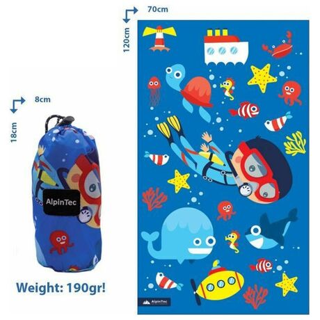 Παιδική Πετσέτα 1.20x70cm της AlpinTec κατασκευασμένη από υψηλής ποιότητας μικροΐνες, στεγνώνει γρήγορα εξαλείφοντας την πιθανότητα ανάπτυξης μικροβίων και μυρωδιών. Οι microfiber πετσέτες της AlpinTec είναι ιδιαίτερα μαλακές, πολύ απορροφητικές (απορροφούν 7 φορές το βάρος τους σε νερό), στεγνώνουν γρήγορα, είναι πολύ ελαφριές και είναι εξαιρετικά αξιόπιστες στην χρήση και στον χρόνο. Συνοδεύεται από μια εύχρηστη θήκη μεταφοράς, διατηρώντας το μικρό της μέγεθος για εύκολη μεταφορά και αποθήκευση σε κάθε σας δραστηριότητα. Είναι ιδανική για χρήση στην Θάλασσα ή και στο κολυμβητήριο. Ταυτόχρονα με την θήκη μεταφοράς κάθε πετσέτα διαθέτει θηλιά για να την κρεμάσετε οπουδήποτε για να στεγνώσει μέσα σε λίγα λεπτά. Πλένεται στο χέρι ή στο πλυντήριο χωρίς την χρήση στεγνωτηρίου. Η χρήση του μαλακτικού ενδείκνυται λόγο μακροχρόνιας χρήσης.