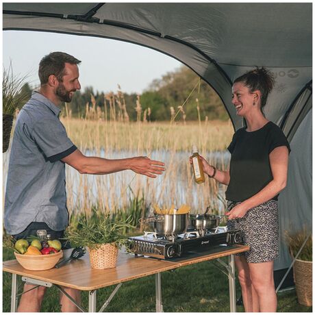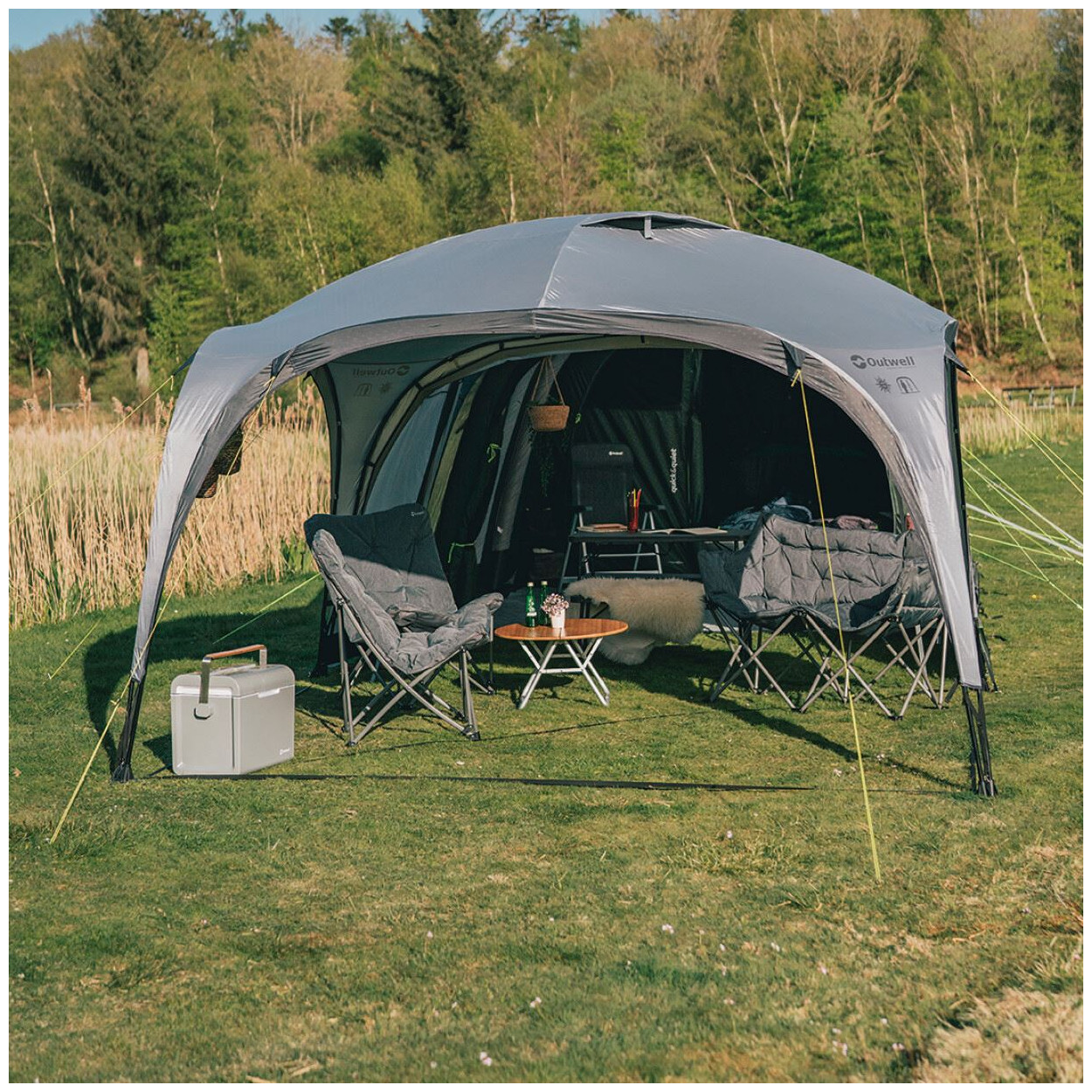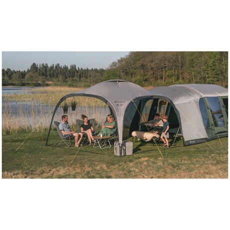 Μια ευέλικτη επιλογή, που μπορεί να σας παρέχει ένα σκιερό και δροσερό περιβάλλον στην αυλή ή την παραλία από την Outwell. Το κιόσκι Event Lounge L με τη στιβαρή και σταθερή κατασκευή του από ατσάλινο σκελετό μπορεί να σας προσφέρει ένα ασφαλές καταφύγιο από τις επιβλαβείς ακτίνες του ήλιου, αλλά και από τη βροχή. Επενδυμένο με πολυεστερικό ύφασμα Outtex® 1500 Select Silver παρέχει αδιαβροχοποίηση 1500 mm, ενώ παράλληλα είναι ενισχυμένο με φίλτρο UPF +50, ώστε να προστατεύει από την ηλιακή ακτινοβολία. Χάρη στις τσέπες σε δίχτυ για την αποθήκευση των μικροαντικειμένων σας, αλλά και τον εύχρηστο γάντζο για τοποθέτηση λάμπας, θα μπορείτε να απολαμβάνετε βέλτιστη εργονομία. Πρόκειται για μια πρακτική επιλογή με άπλετο χώρο και άνετο ύψος, που θα σας χαρίζει αναπαυτικές στιγμές στην ύπαιθρο!
