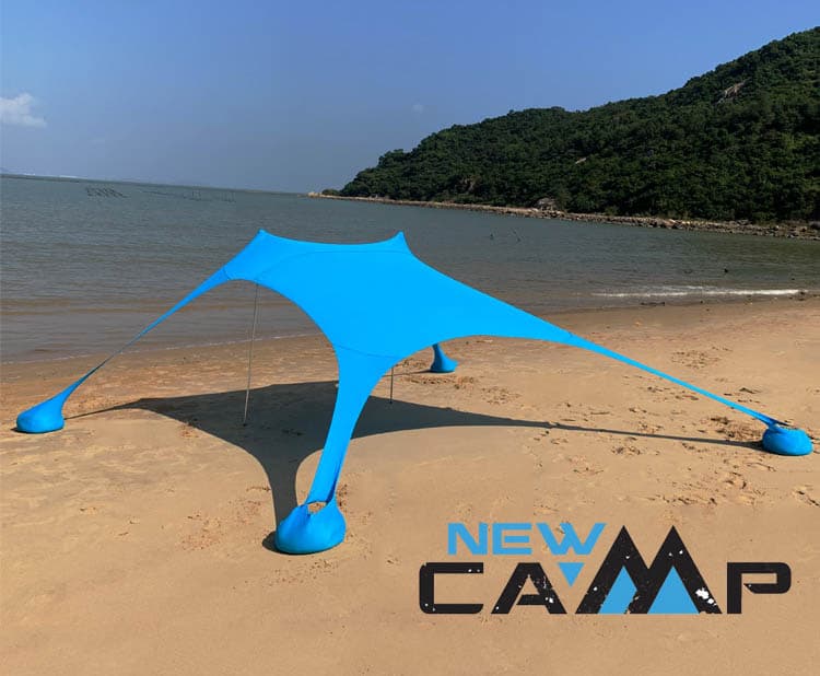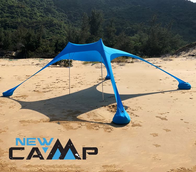 Ελαστική Τέντα Παραλίας Lycra Shelter New Camp Aegean Blue ιδανική για την μέγιστη προστασία σας από τις ακτίνες του ήλιου, όπου και αν βρίσκεστε. Το στήσιμο είναι πολύ εύκολο, απλά τεντώνουμε το ελαστικό πανί στην επιφάνεια που θέλουμε να στήσουμε την τέντα και γεμίζουμε τους ενσωματωμένους σάκους αγκίστρωσης με άμμο. Έπειτα τοποθετούμε τους ορθοστάτες κάτω από το πανί και τους σηκώνουμε, συνιστάται η ελαστική τέντα να είναι προς την κατεύθυνση που φυσάει ο άνεμος. Οι πτυσσόμενοι Ορθοστάτες σας επιτρέπουν να ρυθμίζετε το ύψος της τέντας ανάλογα με τις ανάγκες σας. Οι σάκοι αγκύρωσης βοηθούν στην ασφαλή τοποθέτηση της τέντας. Εύκολη μεταφορά και αποθήκευση χάρη στον σάκο μεταφοράς με βολικό ιμάντα, για να την μεταφέρετε παντού μαζί σας χωρίς να δεσμεύει χώρο.